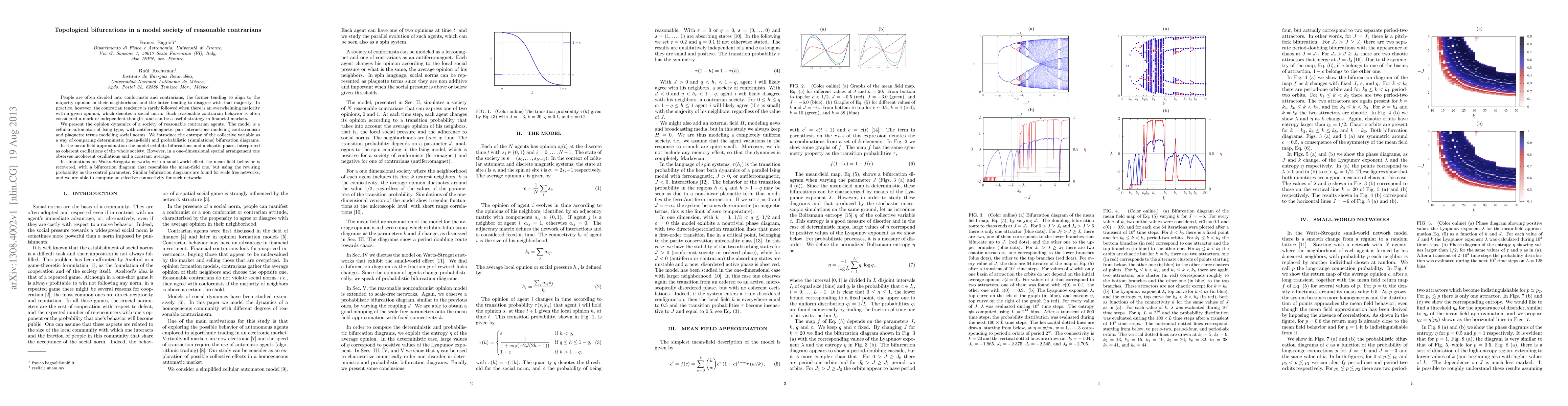 People are often divided into conformists and contrarians, the former tending to align to the majority opinion in their neighborhood and the latter tending to disagree with that majority. In practice, however, the contrarian tendency is rarely followed when there is an overwhelming majority with a given opinion, which denotes a social norm. Such reasonable contrarian behavior is often considered a mark of independent thought, and can be a useful strategy in financial markets. We present the opinion dynamics of a society of reasonable contrarian agents. The model is a cellular automaton of Ising type, with antiferromagnetic pair interactions modeling contrarianism and plaquette terms modeling social norms. We introduce the entropy of the collective variable as a way of comparing deterministic (mean-field) and probabilistic (simulations) bifurcation diagrams. In the mean field approximation the model exhibits bifurcations and a chaotic phase, interpreted as coherent oscillations of the whole society. However, in a one-dimensional spatial arrangement one observes incoherent oscillations and a constant average. In simulations on Watts-Strogatz networks with a small-world effect the mean field behavior is recovered, with a bifurcation diagram that resembles the mean-field one, but using the rewiring probability as the control parameter. Similar bifurcation diagrams are found for scale free networks, and we are able to compute an effective connectivity for such networks.