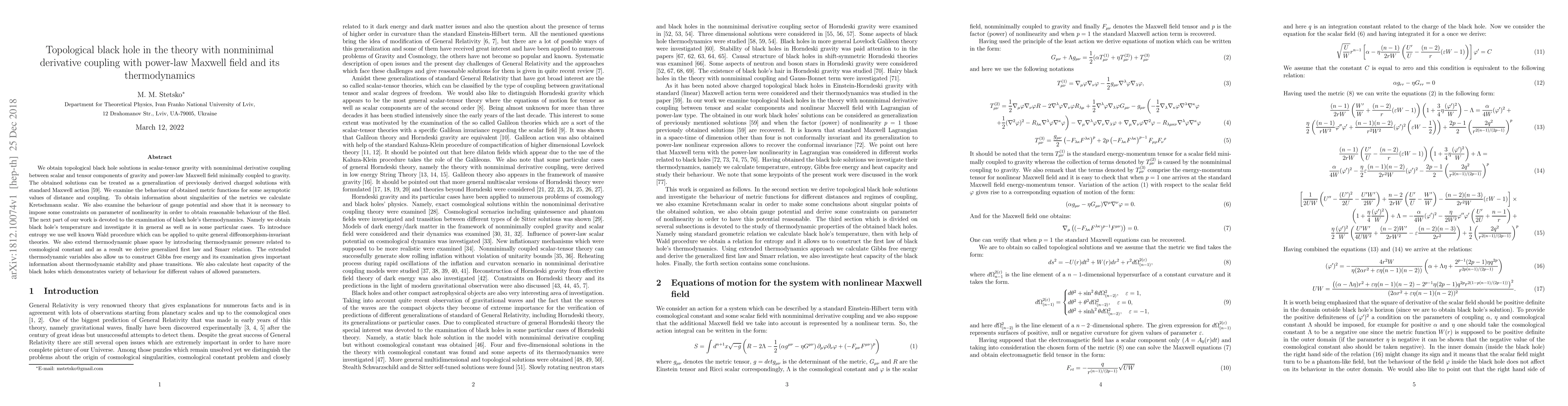 This paper explores topological black hole solutions in scalar-tensor gravity with nonminimal derivative coupling and a power-law Maxwell field. It investigates the thermodynamics of these solutions, deriving temperature, entropy, and heat capacity, and examines phase transitions and stability.