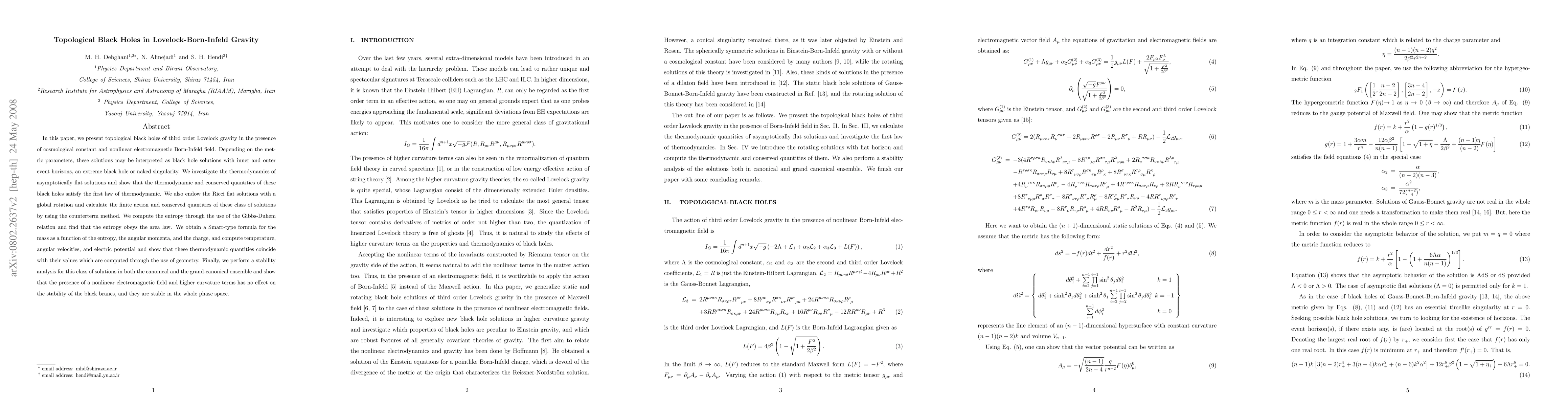 In this paper, we present topological black holes of third order Lovelock gravity in the presence of cosmological constant and nonlinear electromagnetic Born-Infeld field. Depending on the metric parameters, these solutions may be interpreted as black hole solutions with inner and outer event horizons, an extreme black hole or naked singularity. We investigate the thermodynamics of asymptotically flat solutions and show that the thermodynamic and conserved quantities of these black holes satisfy the first law of thermodynamic. We also endow the Ricci flat solutions with a global rotation and calculate the finite action and conserved quantities of these class of solutions by using the counterterm method. We compute the entropy through the use of the Gibbs-Duhem relation and find that the entropy obeys the area law. We obtain a Smarr-type formula for the mass as a function of the entropy, the angular momenta, and the charge, and compute temperature, angular velocities, and electric potential and show that these thermodynamic quantities coincide with their values which are computed through the use of geometry. Finally, we perform a stability analysis for this class of solutions in both the canonical and the grand-canonical ensemble and show that the presence of a nonlinear electromagnetic field and higher curvature terms has no effect on the stability of the black branes, and they are stable in the whole phase space.