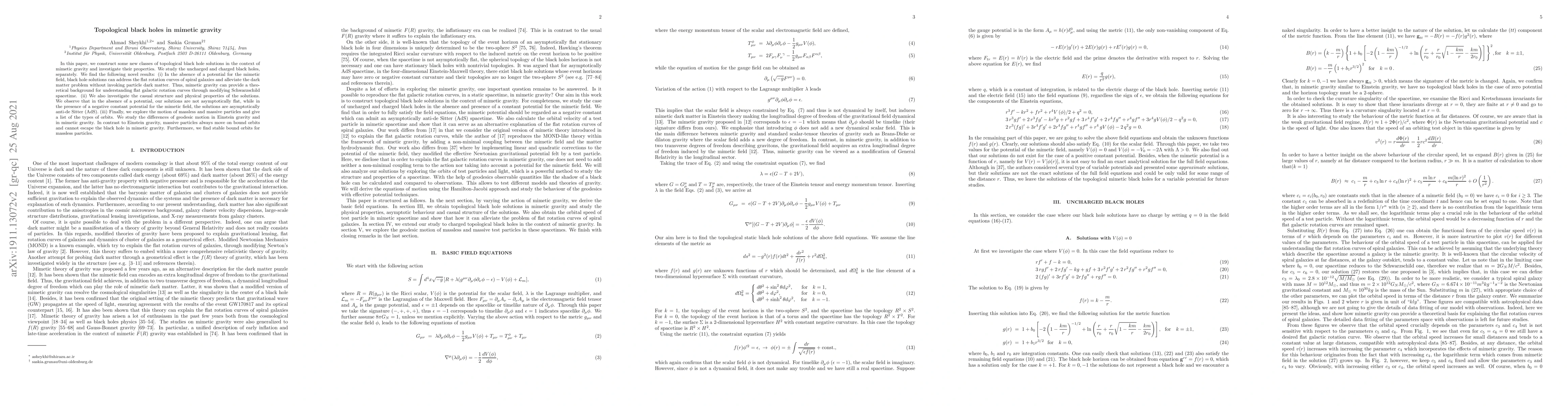 This paper constructs new topological black hole solutions in mimetic gravity, exploring both uncharged and charged cases. It finds that mimetic gravity can explain flat galactic rotation curves without dark matter, and investigates the causal structure and particle orbits, noting differences in geodesic motion compared to Einstein gravity.