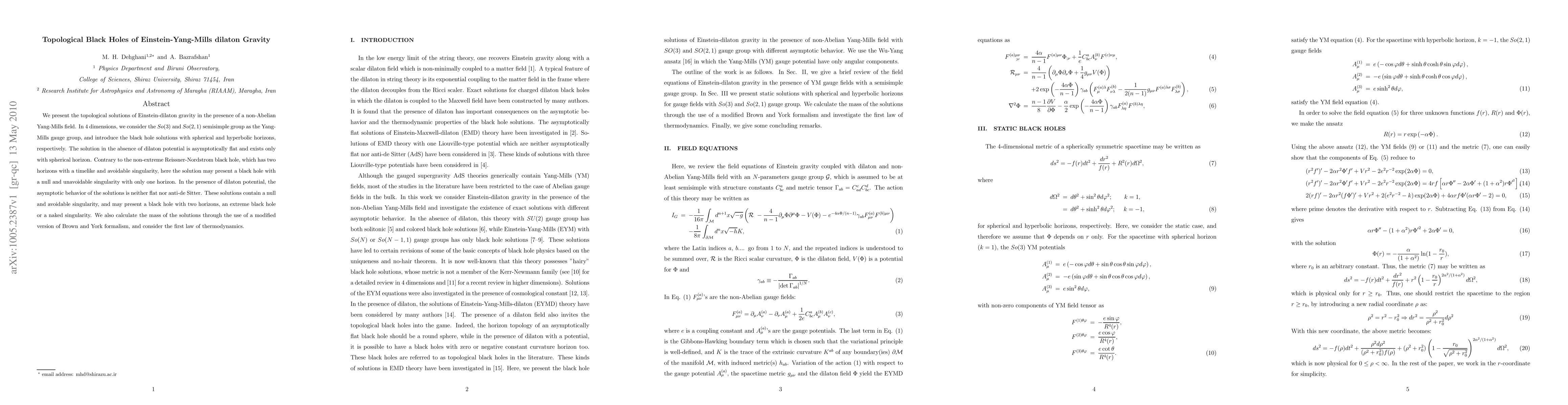 This paper explores topological black hole solutions in 4-dimensional Einstein-dilaton gravity with non-Abelian Yang-Mills fields, identifying black holes with spherical and hyperbolic horizons. It introduces unique cases with null singularities and discusses the impact of dilaton potential on asymptotic behavior and thermodynamic properties.