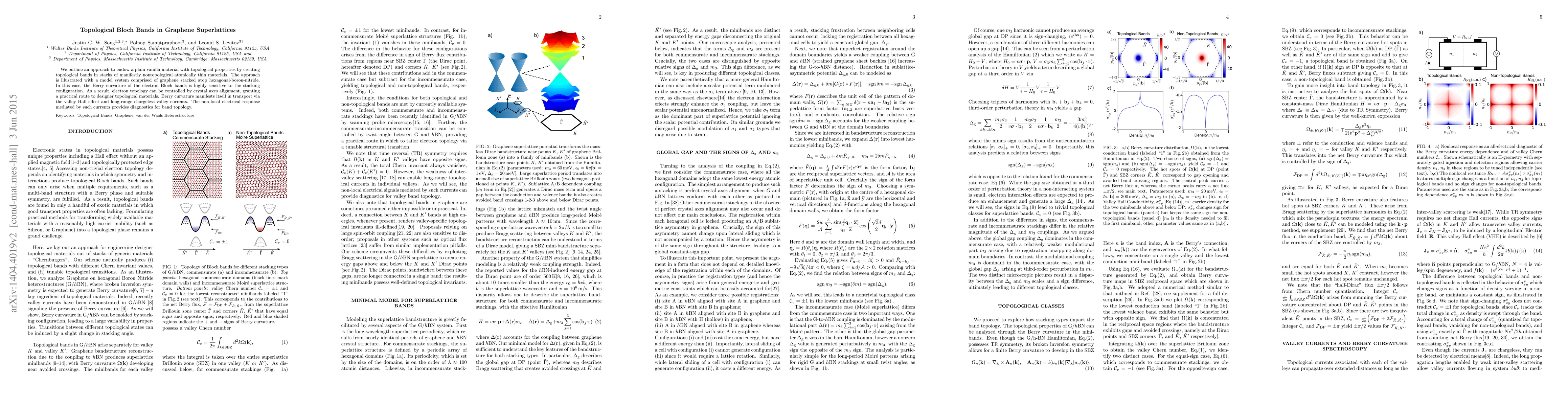 This paper explores how topological Bloch bands can be introduced into graphene superlattices, specifically in graphene stacked atop hexagonal-boron-nitride, by manipulating the stacking configuration. The study highlights the control over electron topology via crystal axes alignment, which manifests in the valley Hall effect and long-range chargeless valley currents, offering a practical method for creating designer topological materials.