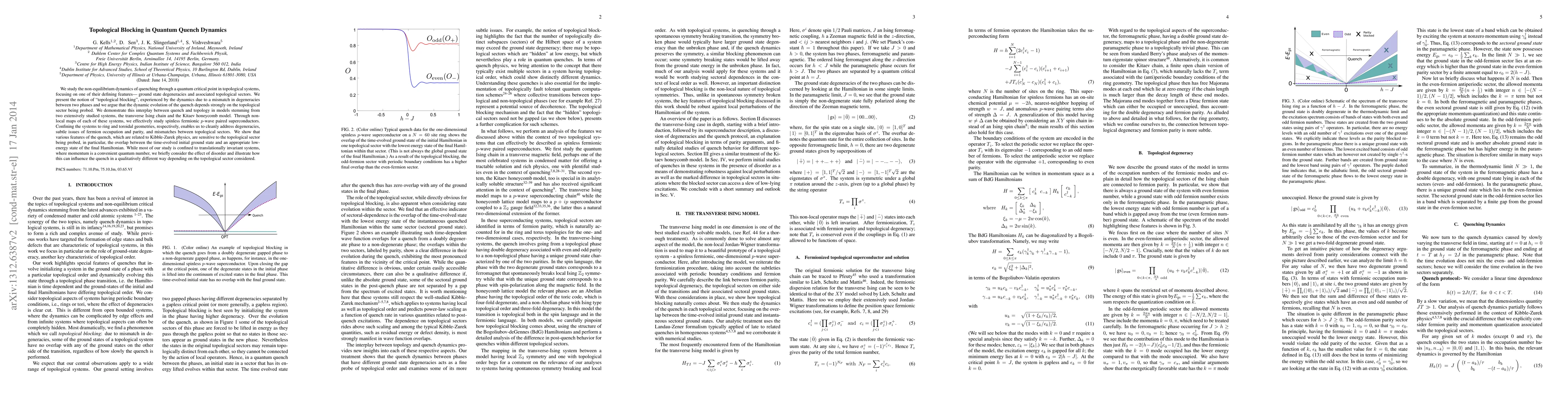 We study the non-equilibrium dynamics of quenching through a quantum critical point in topological systems, focusing on one of their defining features: ground state degeneracies and associated topological sectors. We present the notion of 'topological blocking', experienced by the dynamics due to a mismatch in degeneracies between two phases and we argue that the dynamic evolution of the quench depends strongly on the topological sector being probed. We demonstrate this interplay between quench and topology in models stemming from two extensively studied systems, the transverse Ising chain and the Kitaev honeycomb model. Through non-local maps of each of these systems, we effectively study spinless fermionic $p$-wave paired superconductors. Confining the systems to ring and toroidal geometries, respectively, enables us to cleanly address degeneracies, subtle issues of fermion occupation and parity, and mismatches between topological sectors. We show that various features of the quench, which are related to Kibble-Zurek physics, are sensitive to the topological sector being probed, in particular, the overlap between the time-evolved initial ground state and an appropriate low-energy state of the final Hamiltonian. While most of our study is confined to translationally invariant systems, where momentum is a convenient quantum number, we briefly consider the effect of disorder and illustrate how this can influence the quench in a qualitatively different way depending on the topological sector considered.