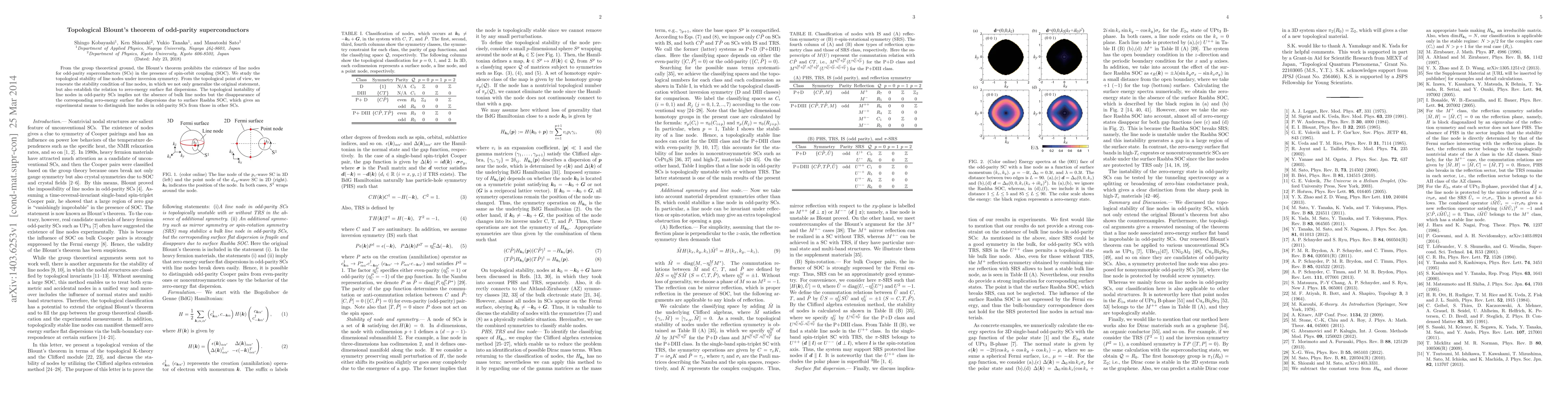 This paper generalizes Blount's theorem for odd-parity superconductors, showing that topological considerations allow for the existence of line nodes despite spin-orbit coupling. It establishes a connection between these nodes and zero-energy surface flat dispersions, providing a method to distinguish them experimentally.