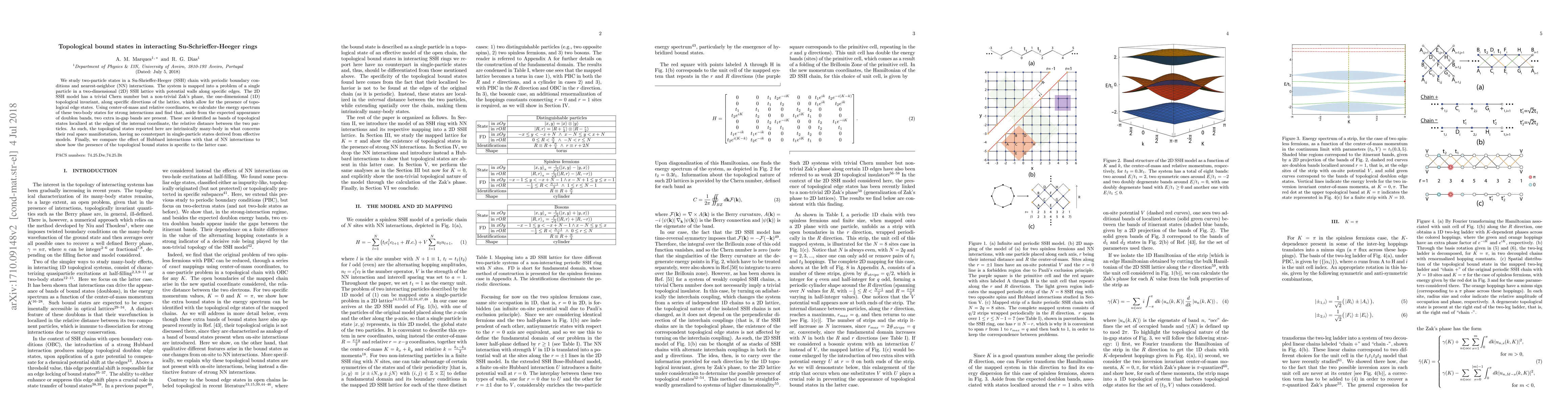We study two-particle states in a Su-Shrieffer-Heeger (SSH) chain with periodic boundary conditions and nearest-neighbor (NN) interactions. The system is mapped into a problem of a single particle in a two-dimensional (2D) SSH lattice with potential walls along specific edges. The 2D SSH model has a trivial Chern number but a non-trivial Zak's phase, the one-dimensional (1D) topological invariant, along specific directions of the lattice, which allow for the presence of topological edge states. Using center-of-mass and relative coordinates, we calculate the energy spectrum of these two-body states for strong interactions and find that, aside from the expected appearance of doublon bands, two extra in-gap bands are present. These are identified as bands of topological states localized at the edges of the internal coordinate, the relative distance between the two particles. As such, the topological states reported here are intrinsically many-body in what concerns their real space manifestation, having no counterpart in single-particle states derived from effective models. Finally, we compare the effect of Hubbard interactions with that of NN interactions to show how the presence of the topological bound states is specific to the latter case.