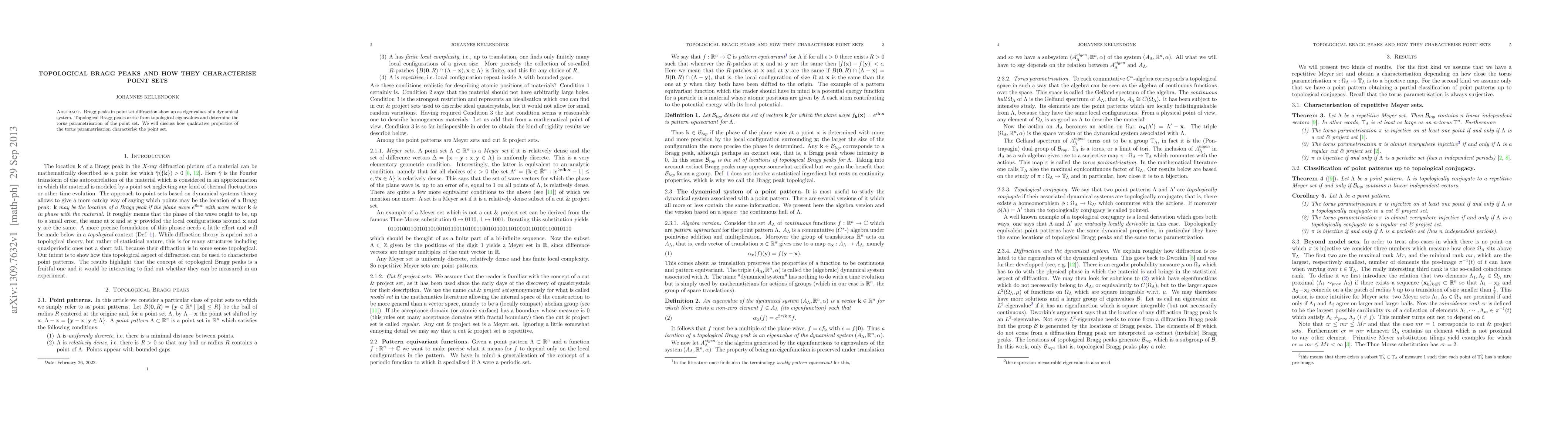 Bragg peaks in point set diffraction show up as eigenvalues of a dynamical system. Topological Bragg peaks arrise from topological eigenvalues and determine the torus parametrisation of the point set. We will discuss how qualitative properties of the torus parametrisation characterise the point set.