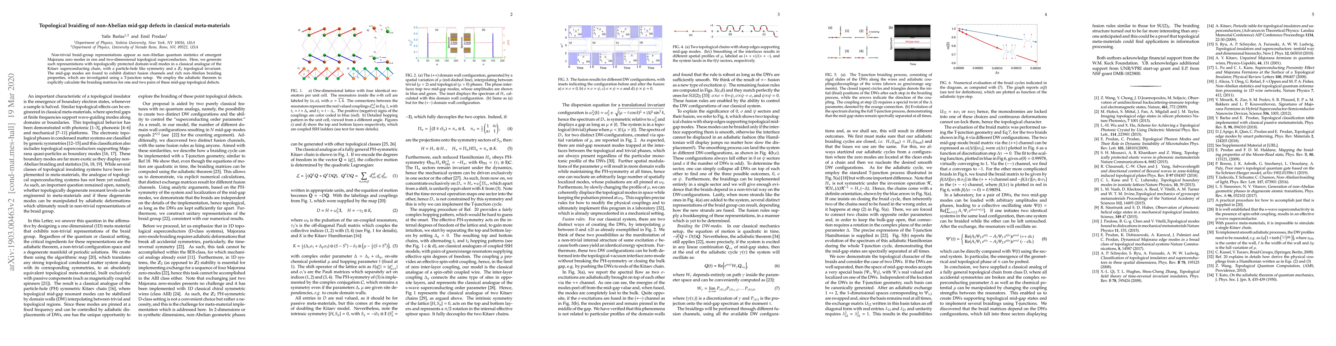 This paper explores the topological braiding of non-Abelian mid-gap defects in classical meta-materials, demonstrating their non-trivial braid-group representations through domain-wall modes in a classical analogue of the Kitaev chain. The study investigates the fusion channels and braiding properties using a T-junction setup and calculates braiding matrices via the adiabatic theorem.