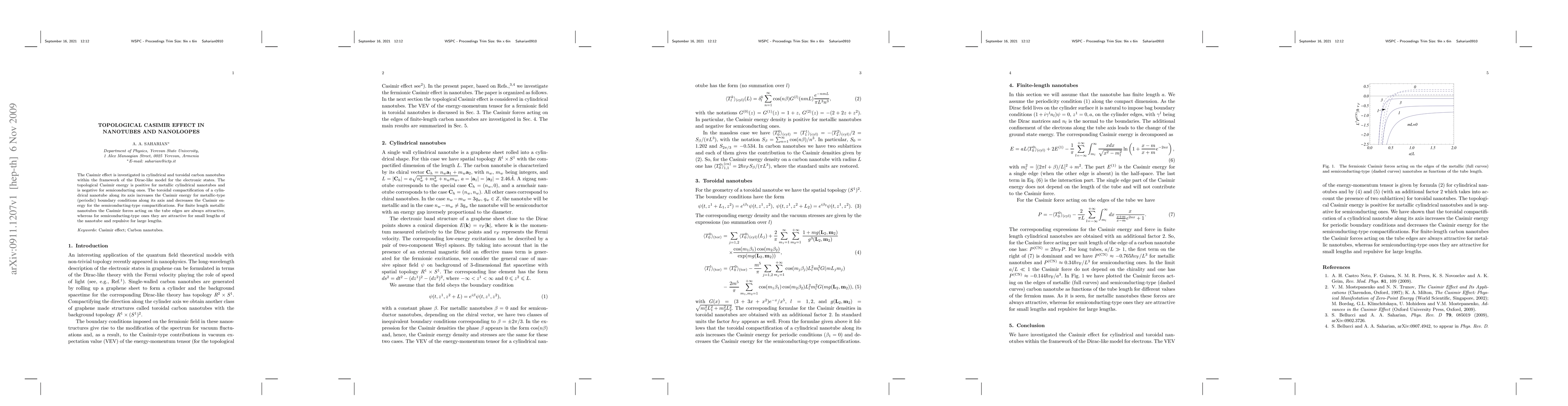 This paper examines the topological Casimir effect in carbon nanotubes and nanoloopes, finding that the Casimir energy is positive for metallic nanotubes and negative for semiconducting ones. It shows that toroidal compactification alters the Casimir energy based on boundary conditions, and that Casimir forces on nanotube edges vary with tube type and length.