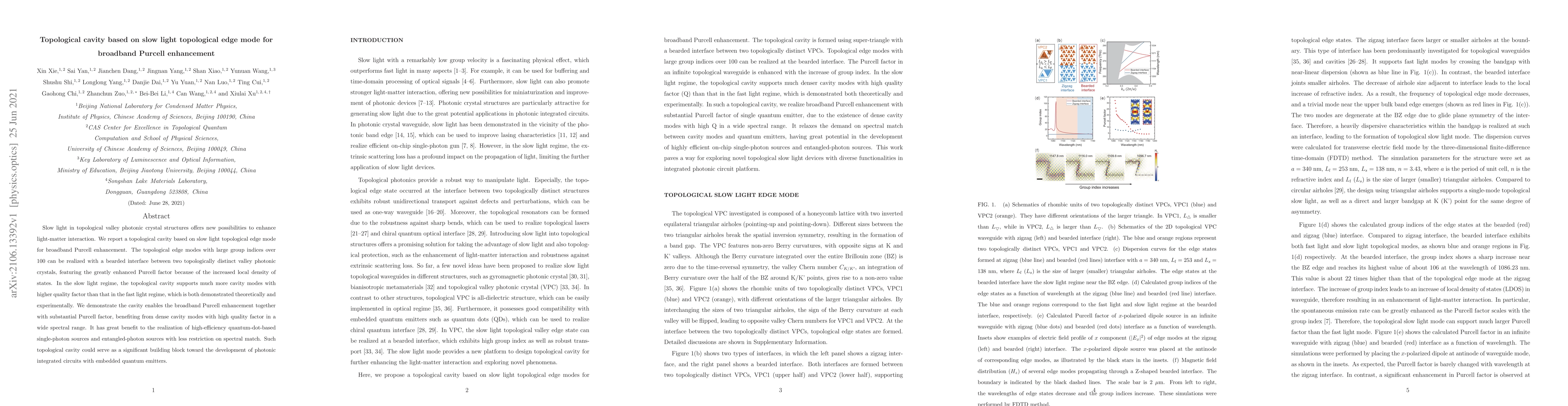 This paper reports a topological cavity utilizing slow light topological edge modes for broadband Purcell enhancement, demonstrating significantly increased local density of states and high-quality cavity modes. The cavity supports a broad spectrum of modes, enhancing light-matter interaction and enabling efficient quantum-dot-based single-photon sources.