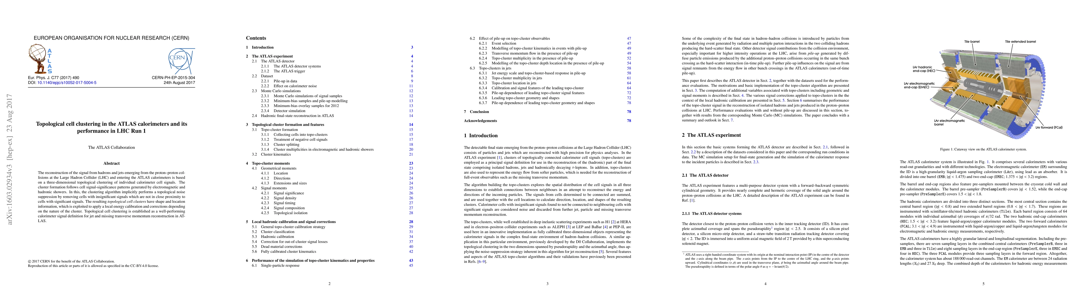 This paper details the topological cell clustering method used in ATLAS calorimeters for LHC Run 1, which combines signal-significance patterns of electromagnetic and hadronic showers. The algorithm suppresses noise by removing insignificant signals not near significant ones, creating clusters with shape and location data for local energy calibration and corrections. The method is proven effective for jet and missing transverse momentum reconstruction.
