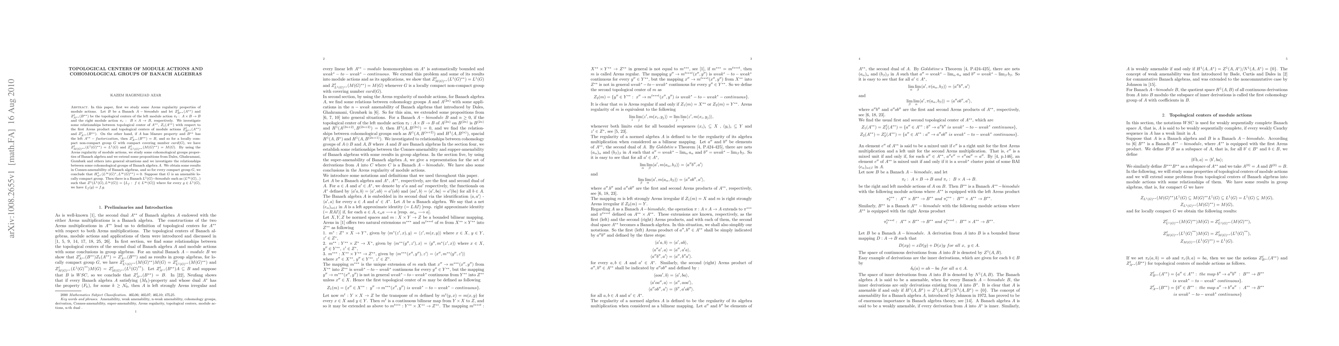 This paper explores the topological centers of module actions in Banach algebras, examining relationships between these centers and the first Arens product. It also investigates cohomological properties and extends propositions regarding Connes-amenability, concluding that for compact groups, the first weak* cohomology group vanishes.