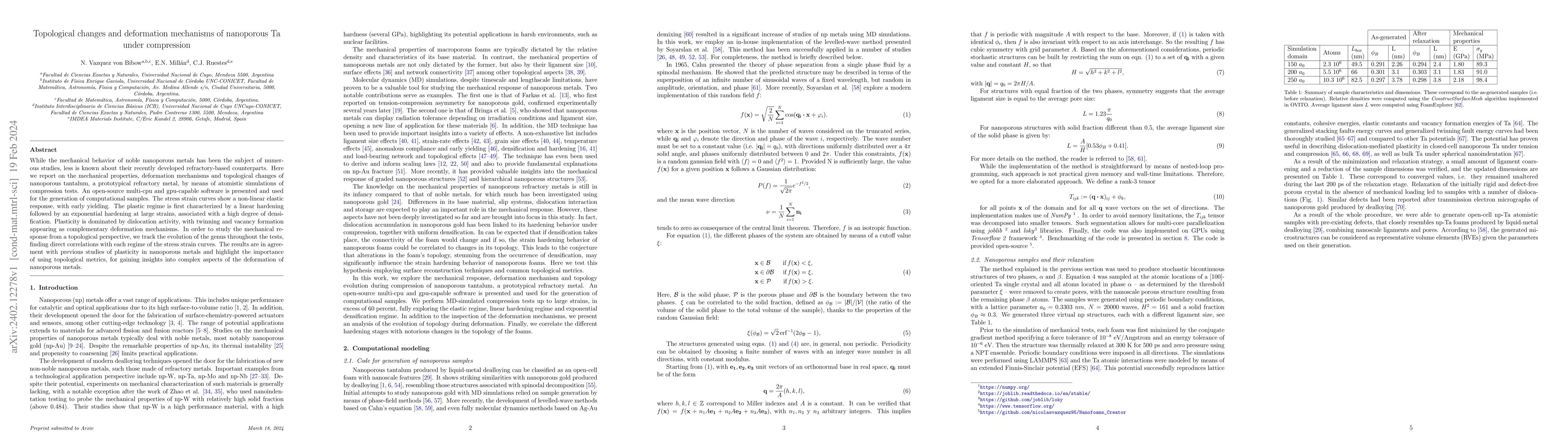 This paper investigates the mechanical properties and deformation mechanisms of nanoporous tantalum under compression using atomistic simulations, revealing a non-linear elastic response followed by linear and exponential hardening. The study highlights dislocation activity, twinning, and vacancy formation as key deformation mechanisms, and uses topological metrics to correlate structural changes with stress-strain behavior.