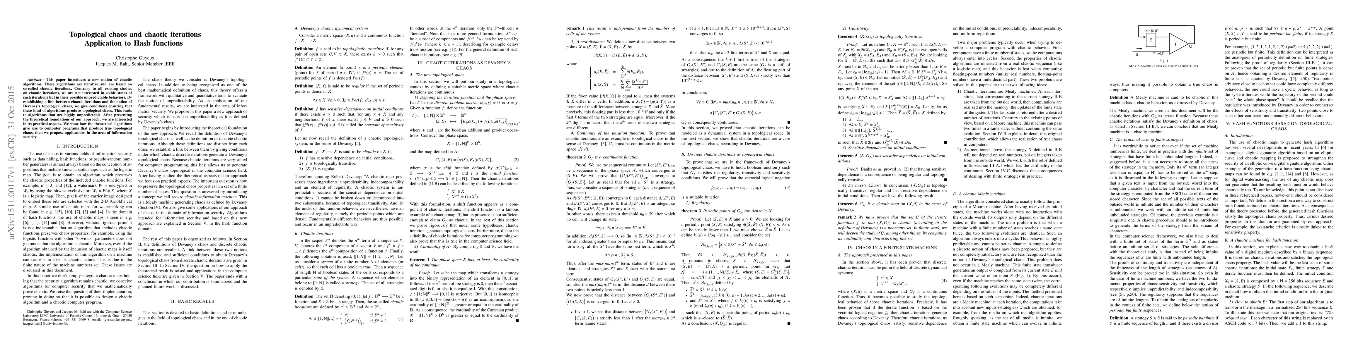 This paper proposes a new class of chaotic iterative algorithms based on Devaney's topological chaos, focusing on their unpredictable behaviors rather than stable states. It demonstrates practical applications of these algorithms in generating true chaotic behavior for use in information security, particularly hash functions.