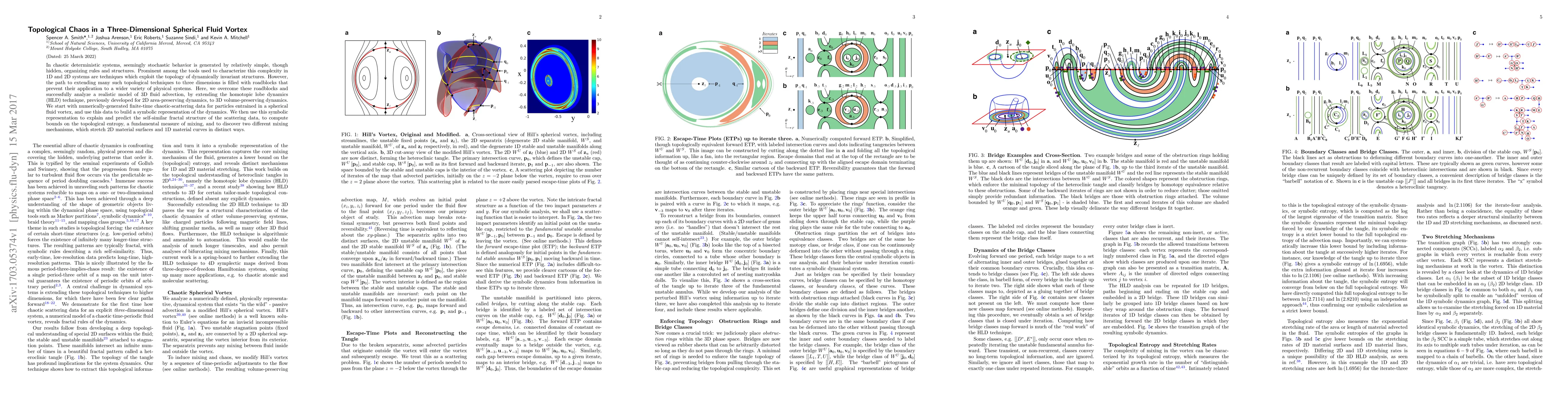In chaotic deterministic systems, seemingly stochastic behavior is generated by relatively simple, though hidden, organizing rules and structures. Prominent among the tools used to characterize this complexity in 1D and 2D systems are techniques which exploit the topology of dynamically invariant structures. However, the path to extending many such topological techniques to three dimensions is filled with roadblocks that prevent their application to a wider variety of physical systems. Here, we overcome these roadblocks and successfully analyze a realistic model of 3D fluid advection, by extending the homotopic lobe dynamics (HLD) technique, previously developed for 2D area-preserving dynamics, to 3D volume-preserving dynamics. We start with numerically-generated finite-time chaotic-scattering data for particles entrained in a spherical fluid vortex, and use this data to build a symbolic representation of the dynamics. We then use this symbolic representation to explain and predict the self-similar fractal structure of the scattering data, to compute bounds on the topological entropy, a fundamental measure of mixing, and to discover two different mixing mechanisms, which stretch 2D material surfaces and 1D material curves in distinct ways.