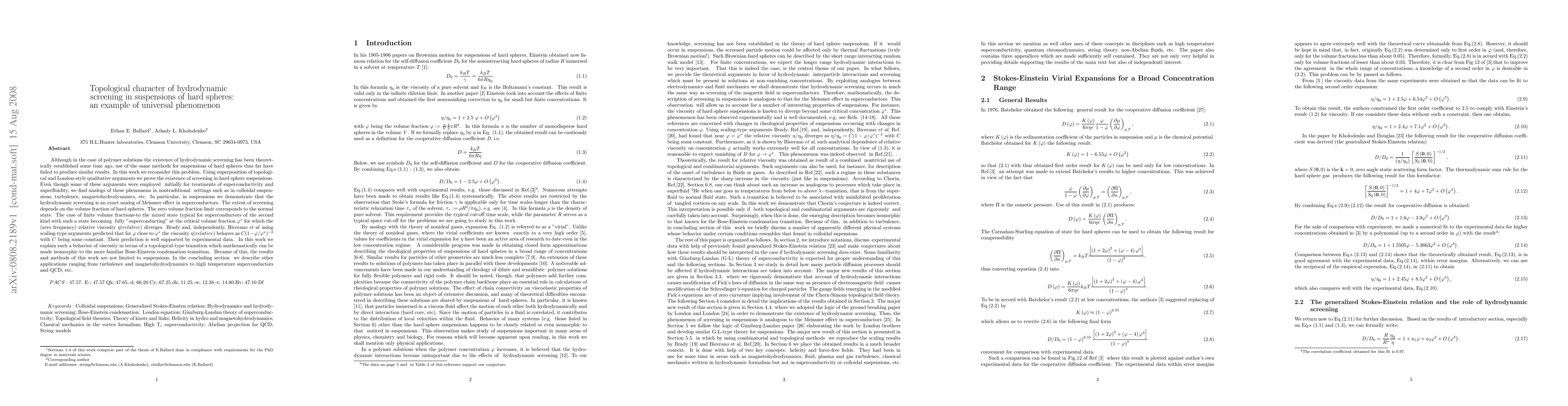 Although in the case of polymer solutions the existence of hydrodynamic screening is considered as established, use of the same methods for suspensions of hard spheres so far have failed to produce similar results. In this work we reconsider this problem. Using superposition of topological, combinatorial and London-style qualitative arguments, we prove the existence of screening in suspensions. We show that the nature of hydrodynamic screening in suspensions is analogous to that known for the Meissner effect in superconductors. The extent of screening depends on volume fraction of hard spheres. The zero volume fraction limit corresponds to the normal state. The case of finite volume fractions-to the mixed state typical for superconductors of the second kind. Such a state is becoming fully "superconducting" at some critical volume fraction for which the (zero frequency) relative viscosity diverges. Our analytical results describing this divergence are in accord with known scaling results obtained by Brady and Bicerano et al which are well supported by experimental data. We provide theoretical explanation of the divergence of relative viscosity in terms of a topological-type transition which mathematically can be made isomorphic to the more familiar Bose-Einstein condensation transition. Because of this, the methods developed in this work are not limited to suspensions only. In concluding section we mention other applications of the developed formalism ranging from turbulence and magnetohydrodynamics to high temperature superconductors, QCD, string models, etc.