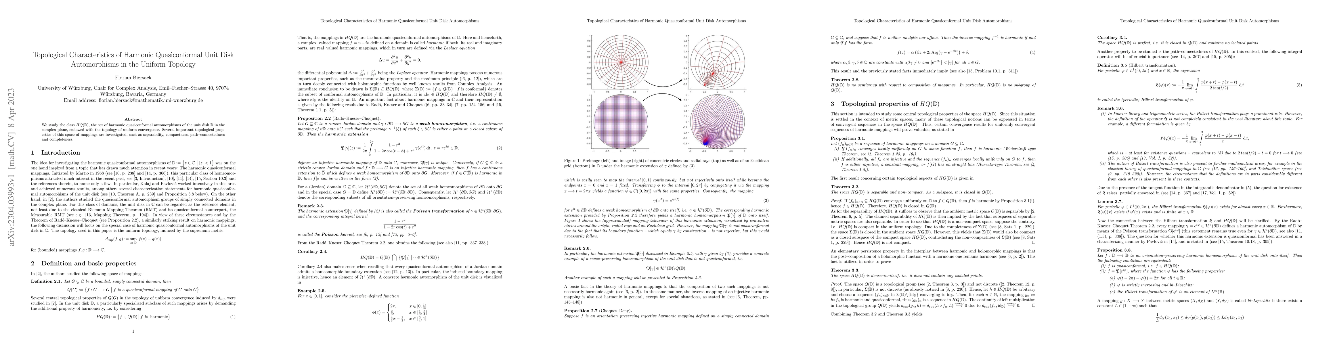This paper investigates the topological properties of harmonic quasiconformal automorphisms of the unit disk, focusing on separability, compactness, path-connectedness, and completeness in the uniform topology. The study aims to understand the structure and characteristics of the space $HQ(\mathbb{D})$.