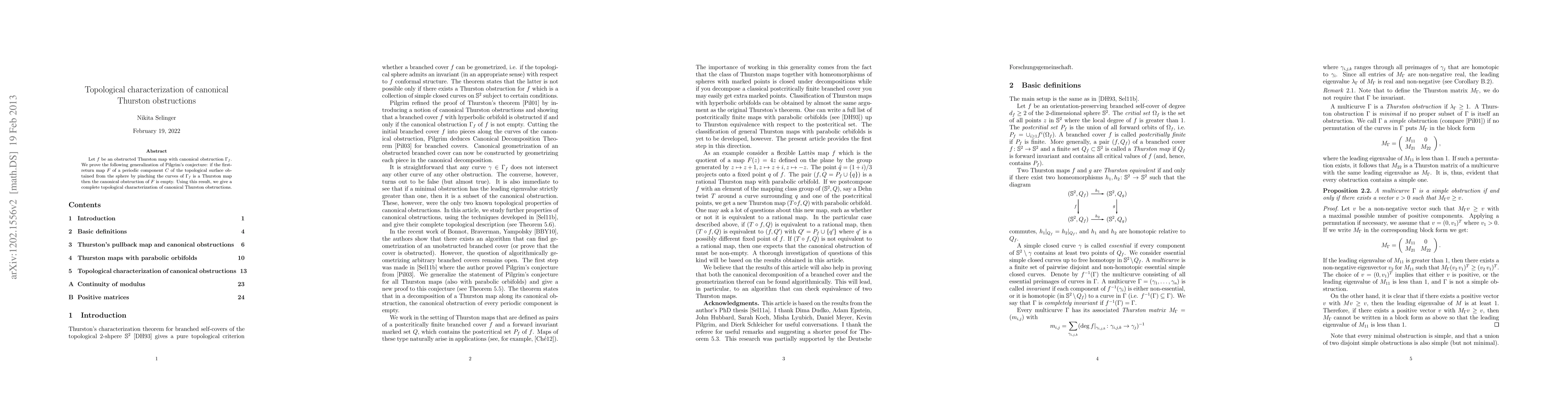 Let f be an obstructed Thurston map with canonical obstruction \Gamma_f. We prove the following generalization of Pilgrim's conjecture: if the first-return map F of a periodic component C of the topological surface obtained from the sphere by pinching the curves of \Gamma_f is a Thurston map then the canonical obstruction of F is empty. Using this result, we give a complete topological characterization of canonical Thurston obstructions.