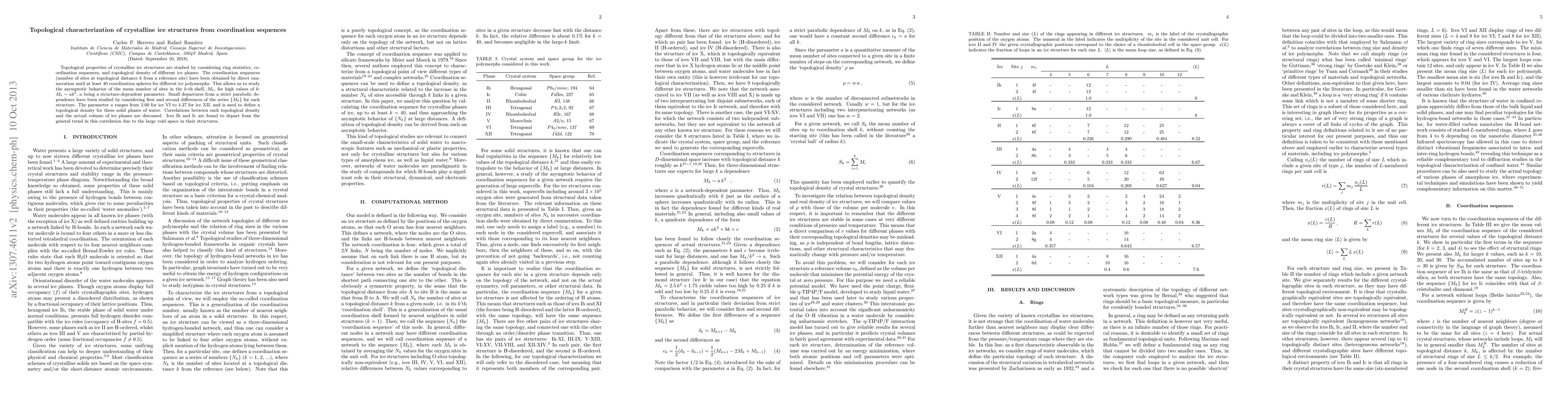 Topological properties of crystalline ice structures are studied by considering ring statistics, coordination sequences, and topological density of different ice phases. The coordination sequences (number of sites at topological distance k from a reference site) have been obtained by direct enumeration until at least 40 coordination spheres for different ice polymorphs. This allows us to study the asymptotic behavior of the mean number of sites in the k-th shell, M_k, for high values of k: M_k ~ a k^2, a being a structure-dependent parameter. Small departures from a strict parabolic dependence have been studied by considering first and second differences of the series {M_k} for each structure. The parameter a ranges from 2.00 for ice VI to 4.27 for ice XII, and is used to define a topological density for these solid phases of water. Correlations between such topological density and the actual volume of ice phases are discussed. Ices Ih and Ic are found to depart from the general trend in this correlation due to the large void space in their structures.