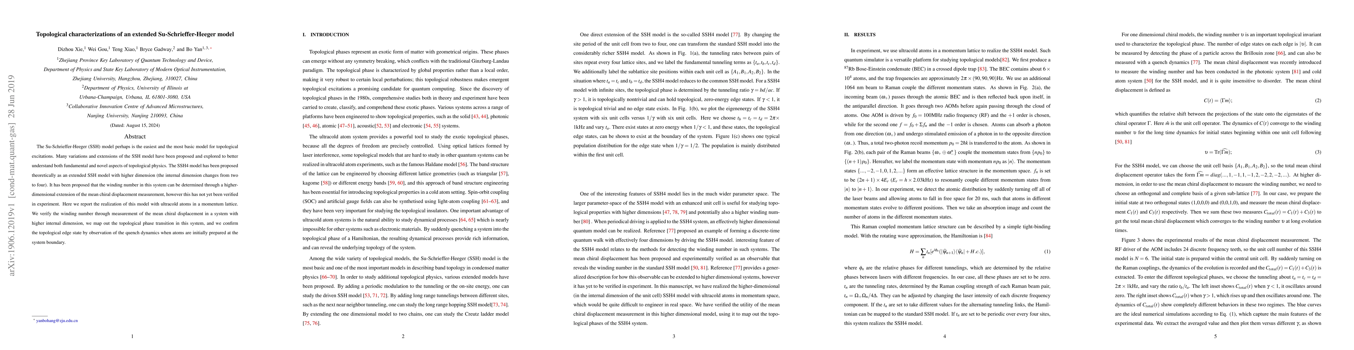 This paper investigates the topological properties of an extended Su-Schrieffer-Heeger (SSH4) model realized with ultracold atoms, verifying the winding number via mean chiral displacement measurement and confirming topological edge states through quench dynamics.