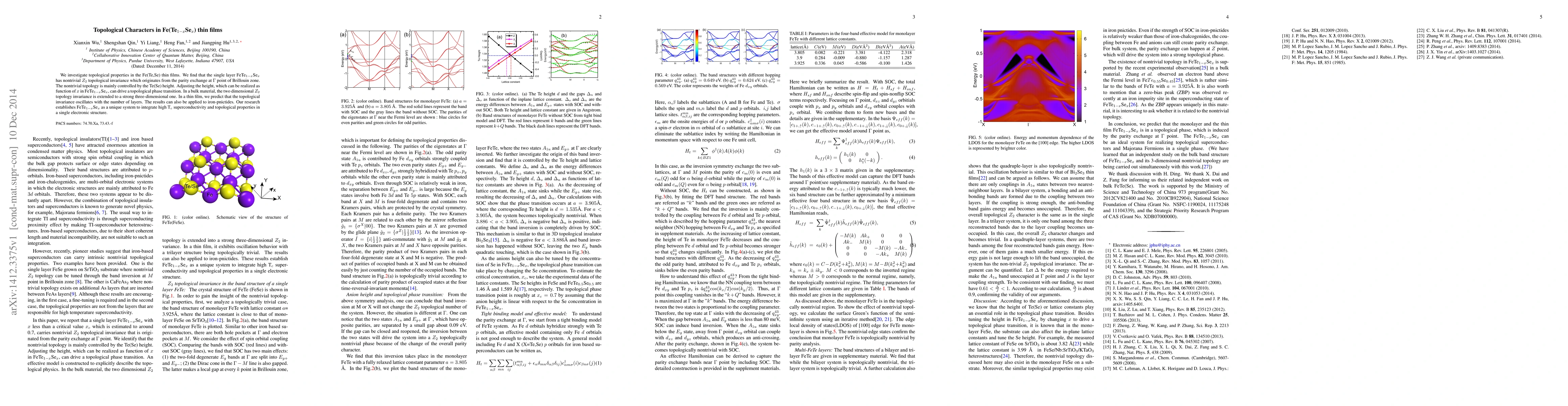 We investigate topological properties in the Fe(Te,Se) thin films. We find that the single layer FeTe$_{1-x}$Se$_x$ has nontrivial $Z_2$ topological invariance which originates from the parity exchange at $\Gamma$ point of Brillouin zone. The nontrivial topology is mainly controlled by the Te(Se) height. Adjusting the height, which can be realized as function of $x$ in FeTe$_{1-x}$Se$_x$, can drive a topological phase transition. In a bulk material, the two dimensional $Z_2$ topology invariance is extended to a strong three-dimensional one. In a thin film, we predict that the topological invariance oscillates with the number of layers. The results can also be applied to iron-pnictides. Our research establishes FeTe$_{1-x}$Se$_x$ as a unique system to integrate high T$_c$ superconductivity and topological properties in a single electronic structure.