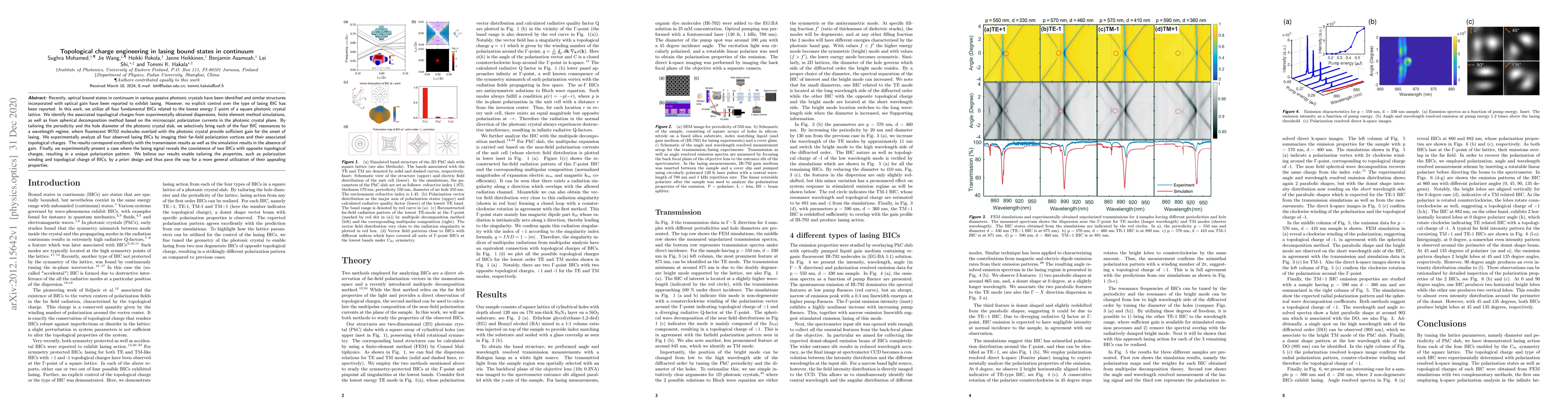 This paper demonstrates the engineering of topological charges in lasing bound states in continuum (BIC) within photonic crystals by controlling the periodicity and hole diameter. The study reveals four fundamental BICs, each with distinct topological charges, and shows how to selectively induce lasing in each by overlaying fluorescent molecules, resulting in unique polarization patterns and vortex structures.
