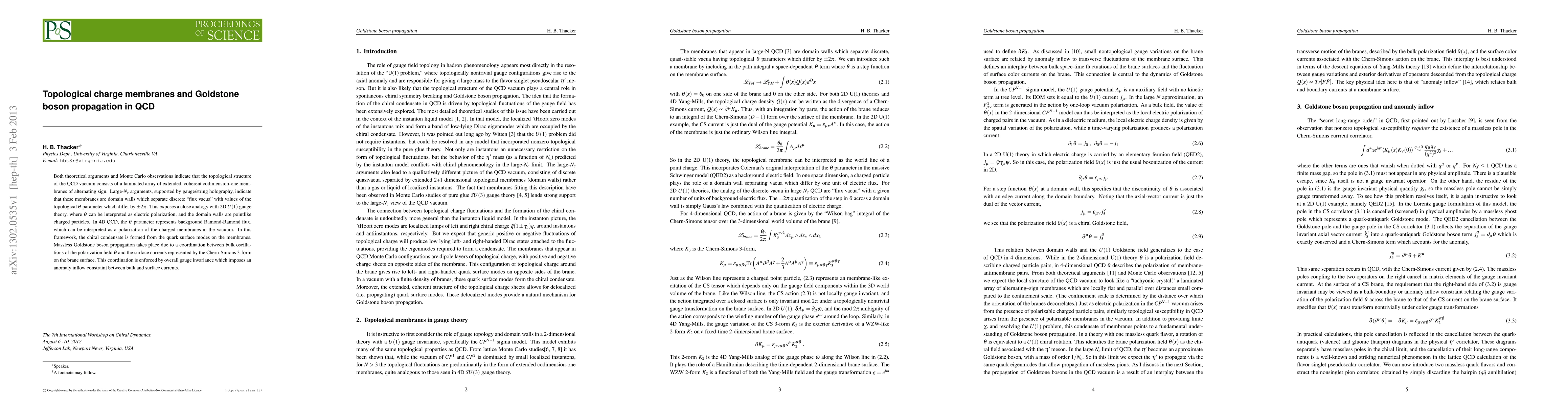 Both theoretical arguments and Monte Carlo observations indicate that the topological structure of the QCD vacuum consists of a laminated array of extended, coherent codimension-one membranes of alternating sign. Large-$N_c$ arguments, supported by gauge/string holography, indicate that these membranes are domain walls which separate discrete "flux vacua" with values of the topological $\theta$ parameter which differ by $\pm 2\pi$. This exposes a close analogy with 2D U(1) gauge theory, where $\theta$ can be interpreted as electric polarization, and the domain walls are pointlike charged particles. In 4D QCD, the $\theta$ parameter represents background Ramond-Ramond flux, which can be interpreted as a polarization of the charged membranes in the vacuum. In this framework, the chiral condensate is formed from the quark surface modes on the membranes. Massless Goldstone boson propagation takes place due to a coordination between bulk oscillations of the polarization field $\theta$ and the surface currents represented by the Chern-Simons 3-form on the brane surface. This coordination is enforced by overall gauge invariance which imposes an anomaly inflow constraint between bulk and surface currents.