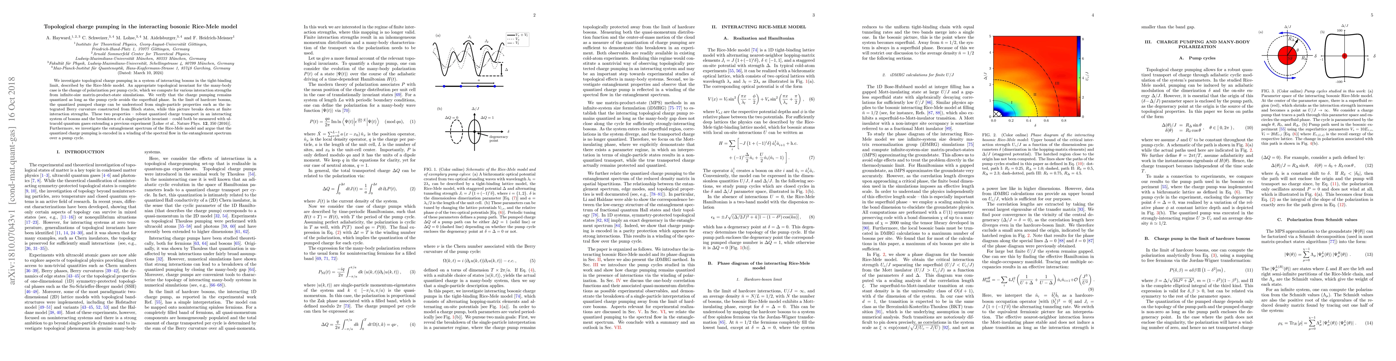 This paper investigates topological charge pumping in the interacting bosonic Rice-Mele model, showing that quantized charge transport remains robust except in the superfluid phase. The study reveals a breakdown of single-particle invariants at finite interaction strengths and suggests the entanglement spectrum encodes the quantized charge pumping.