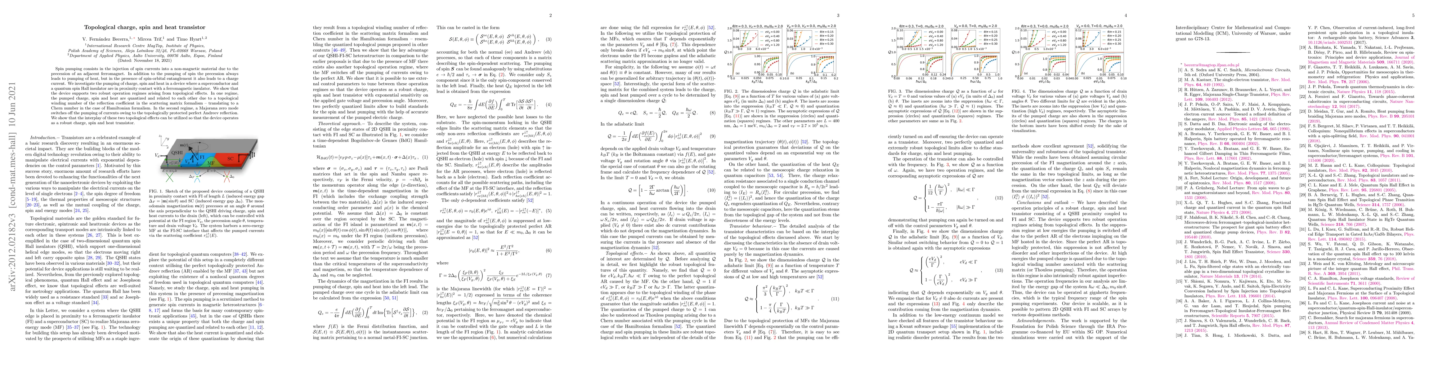 This paper investigates a device combining a superconductor, a quantum spin Hall insulator, and a ferromagnetic insulator, demonstrating two topological regimes. The device functions as a robust charge, spin, and heat transistor, with quantized pumping in one regime and zero-mode-induced current suppression in the other.