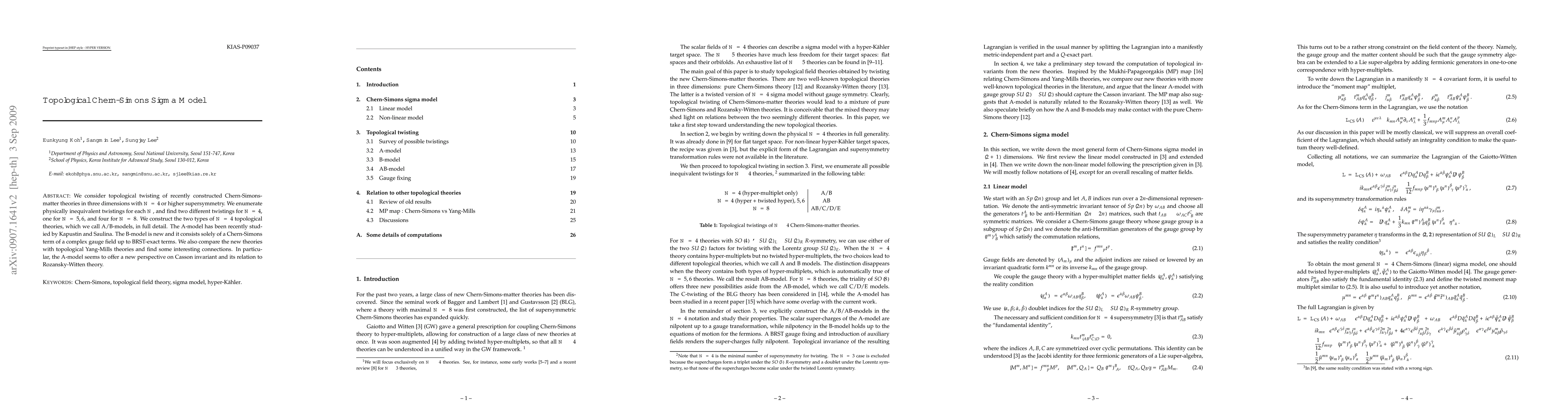 We consider topological twisting of recently constructed Chern-Simons-matter theories in three dimensions with N=4 or higher supersymmetry. We enumerate physically inequivalent twistings for each N, and find two different twistings for N=4, one for N=5,6, and four for N=8. We construct the two types of N=4 topological theories, which we call A/B-models, in full detail. The A-model has been recently studied by Kapustin and Saulina. The B-model is new and it consists solely of a Chern-Simons term of a complex gauge field up to BRST-exact terms. We also compare the new theories with topological Yang-Mills theories and find some interesting connections. In particular, the A-model seems to offer a new perspective on Casson invariant and its relation to Rozansky-Witten theory.