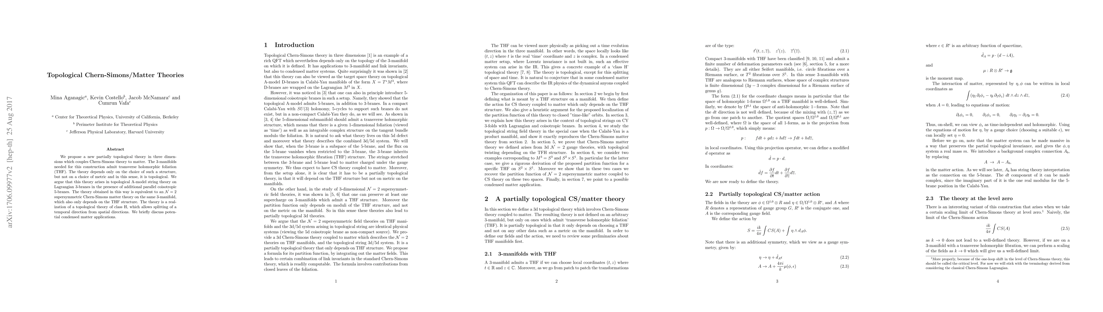 We propose a new partially topological theory in three dimensions which couples Chern-Simons theory to matter. The 3-manifolds needed for this construction admit transverse holomorphic foliation (THF). The theory depends only on the choice of such a structure, but not on a choice of metric and in this sense, it is topological. We argue that this theory arises in topological A-model string theory on Lagrangian 3-branes in the presence of additional parallel coisotropic 5-branes. The theory obtained in this way is equivalent to an N=2 supersymmetric Chern-Simons matter theory on the same 3-manifold, which also only depends on the THF structure. The theory is a realization of a topological theory of class H, which allows splitting of a temporal direction from spatial directions. We briefly discuss potential condensed matter applications.