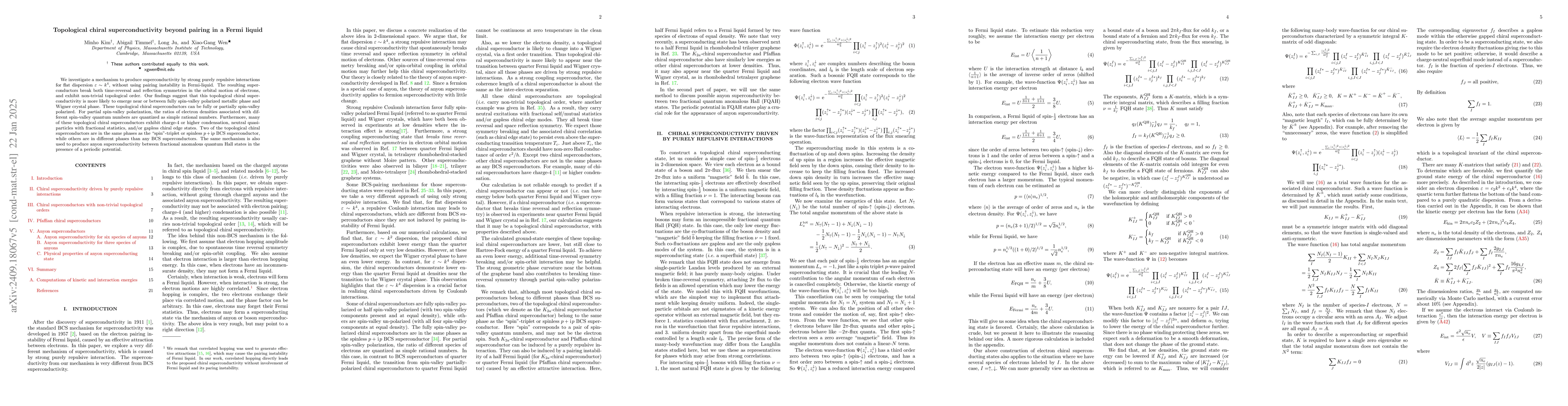 We investigate a mechanism to produce superconductivity by strong purely repulsive interactions for flat dispersion $\varepsilon \sim k^4$, without using pairing instability in Fermi-liquid. The resulting superconductors break both time-reversal and reflection symmetries in the orbital motion of electrons, and exhibit non-trivial topological order. Our findings suggest that this topological chiral superconductivity is more likely to emerge near or between fully spin-valley polarized metallic phase and Wigner crystal phase. These topological chiral superconductors can be fully or partially spin-valley polarized. For partial spin-valley polarization, the ratios of electron densities associated with different spin-valley quantum numbers are quantized as simple rational numbers. Furthermore, many of these topological chiral superconductors exhibit charge-4 or higher condensation, neutral quasiparticles with fractional statistics, and/or gapless chiral edge states. Two of the topological chiral superconductors are in the same phases as the ``spin''-triplet or spinless $p+ \textrm{i} p$ BCS superconductor, while others are in different phases than any BCS superconductors. The same mechanism is also used to produce anyon superconductivity between fractional anomalous quantum Hall states in the presence of a periodic potential.