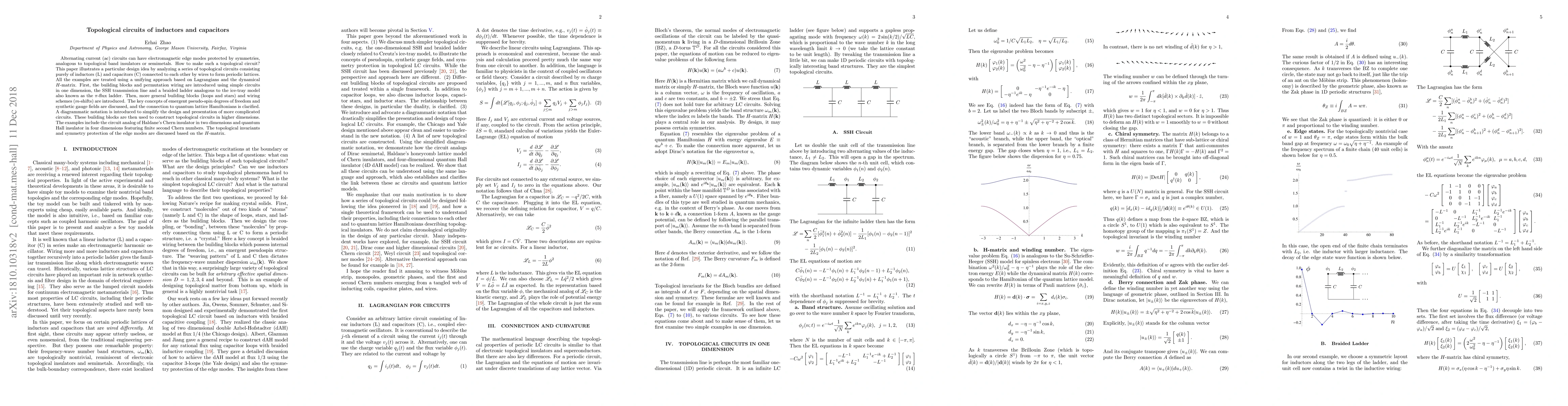 Alternating current (ac) circuits can have electromagnetic edge modes protected by symmetries, analogous to topological band insulators or semimetals. How to make such a topological circuit? This paper illustrates a particular design idea by analyzing a series of topological circuits consisting purely of inductors (L) and capacitors (C) connected to each other by wires to form periodic lattices. All the examples are treated using a unifying approach based on Lagrangians and the dynamical $H$-matrix. First, the building blocks and permutation wiring are introduced using simple circuits in one dimension, the SSH transmission line and a braided ladder analogous to the ice-tray model also known as the $\pi$-flux ladder. Then, more general building blocks (loops and stars) and wiring schemes ($m$-shifts) are introduced. The key concepts of emergent pseudo-spin degrees of freedom and synthetic gauge fields are discussed, and the connection to quantum lattice Hamiltonians is clarified. A diagrammatic notation is introduced to simplify the design and presentation of more complicated circuits. These building blocks are then used to construct topological circuits in higher dimensions. The examples include the circuit analog of Haldane's Chern insulator in two dimensions and quantum Hall insulator in four dimensions featuring finite second Chern numbers. The topological invariants and symmetry protection of the edge modes are discussed based on the $H$-matrix.
