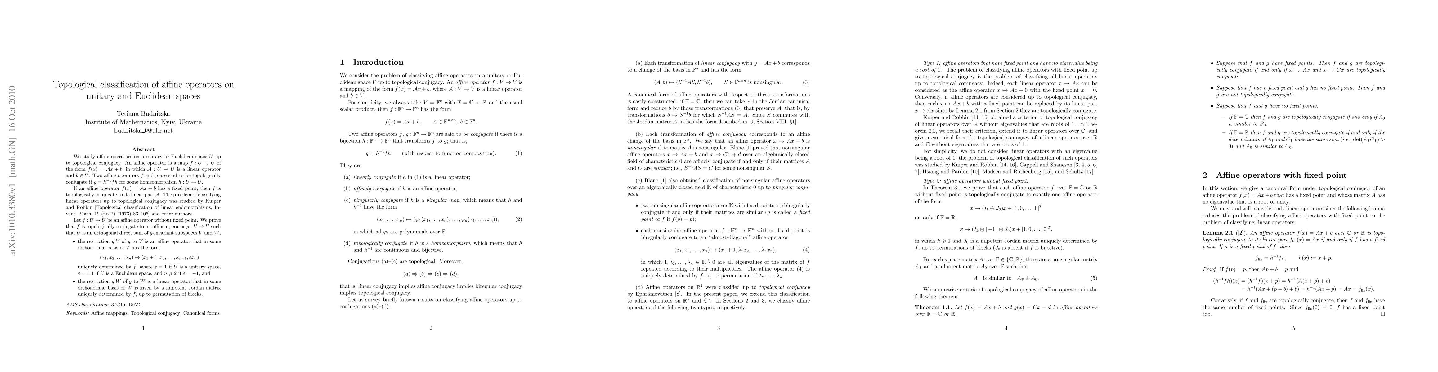 This paper classifies affine operators in unitary and Euclidean spaces up to topological conjugacy, determining if two operators are conjugate via a homeomorphism. The focus is on the form f(x) = Ax + b, where A is a linear operator and b is a vector in the space.