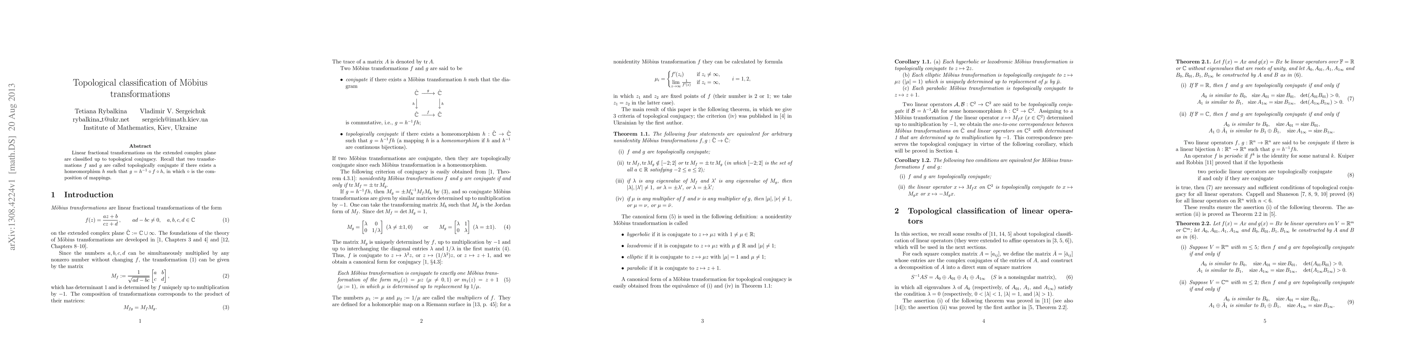 Linear fractional transformations on the extended complex plane are classified up to topological conjugacy. Recall that two transformations f and g are called topologically conjugate if there exists a homeomorphism h such that hg=fh.