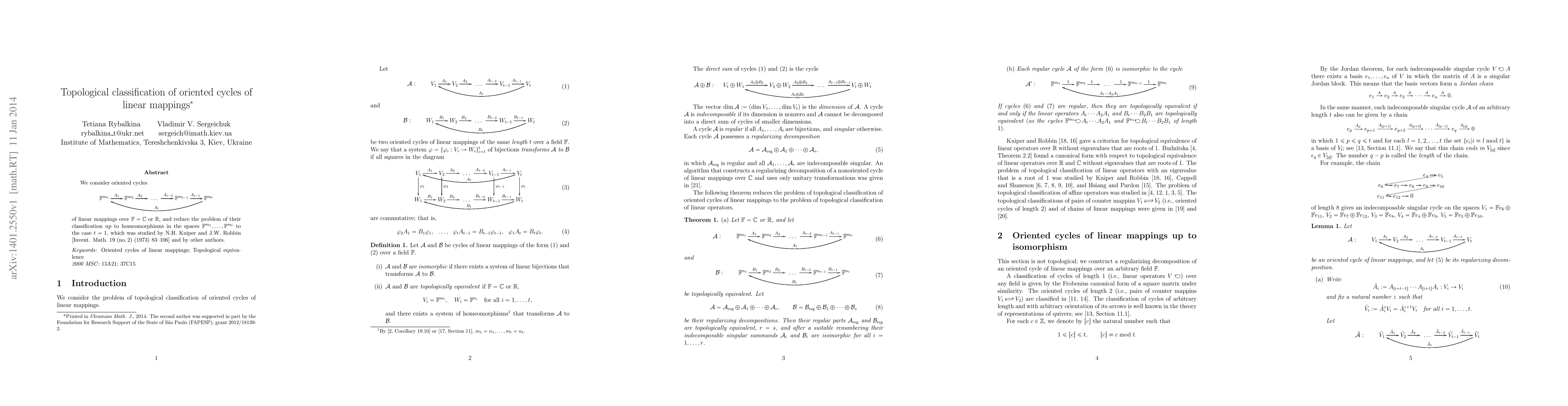 This paper explores the topological classification of oriented cycles of linear mappings between finite-dimensional vector spaces, reducing the problem to classifying linear operators up to homeomorphism, a topic previously studied by Kuiper and Robbin.