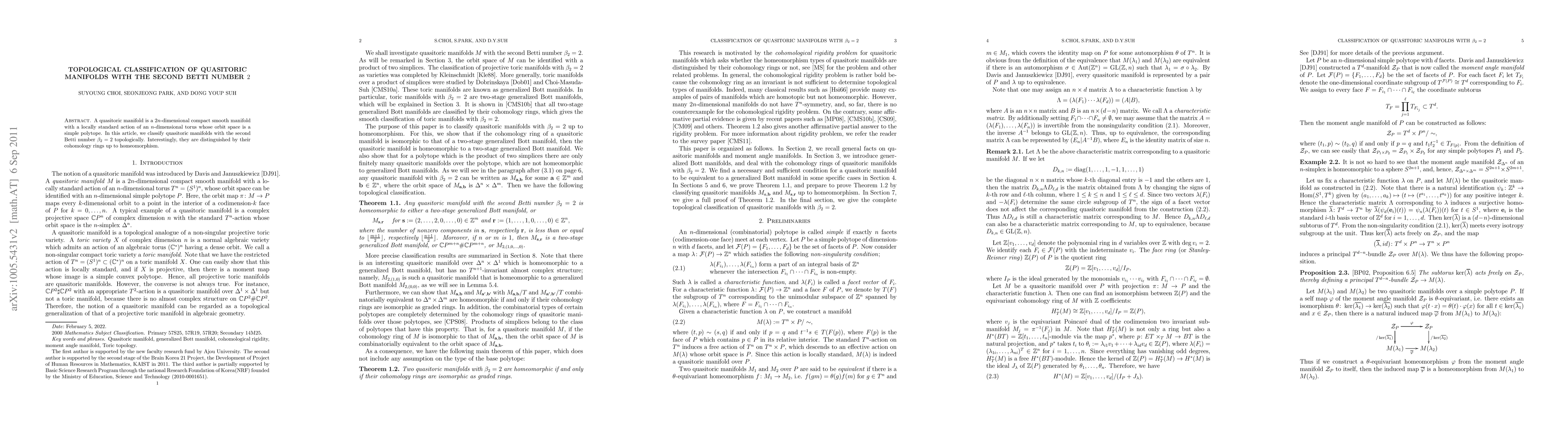 A quasitoric manifold is a $2n$-dimensional compact smooth manifold with a locally standard action of an $n$-dimensional torus whose orbit space is a simple polytope. In this article, we classify quasitoric manifolds with the second Betti number $\beta_2=2$ topologically. Interestingly, they are distinguished by their cohomology rings up to homeomorphism.