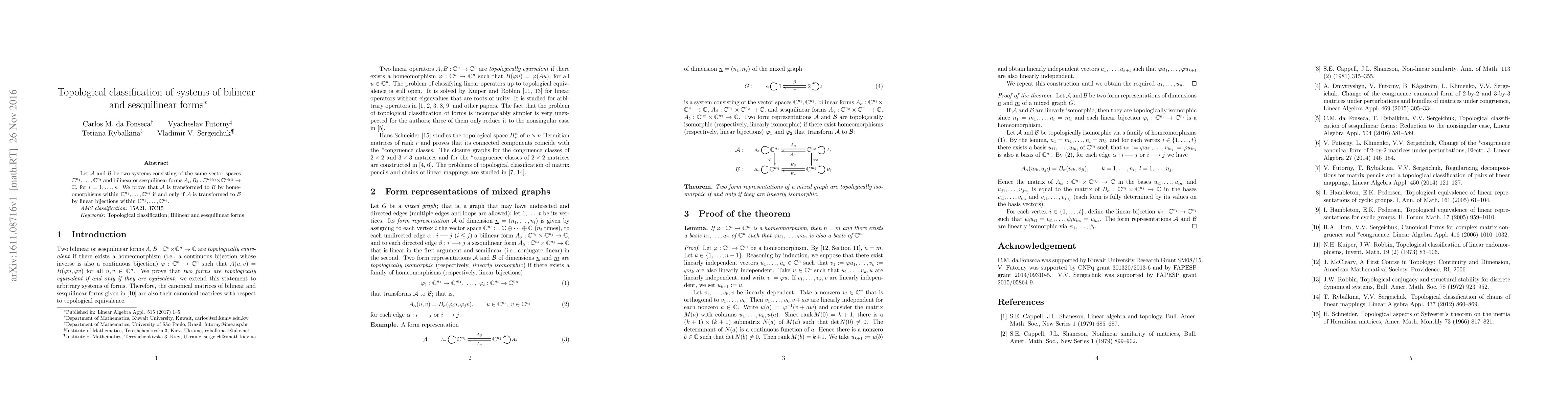 Let $\cal A$ and $\cal B$ be two systems consisting of the same vector spaces $\mathbb C^{n_1},\dots,\mathbb C^{n_t}$ and bilinear or sesquilinear forms $A_i,B_i:\mathbb C^{n_{k(i)}}\times\mathbb C^{n_{l(i)}}\to\mathbb C$, for $i=1,\dots,s$. We prove that $\cal A$ is transformed to $\cal B$ by homeomorphisms within $\mathbb C^{n_1},\dots,\mathbb C^{n_t}$ if and only if $\cal A$ is transformed to $\cal B$ by linear bijections within $\mathbb C^{n_1},\dots,\mathbb C^{n_t}$.