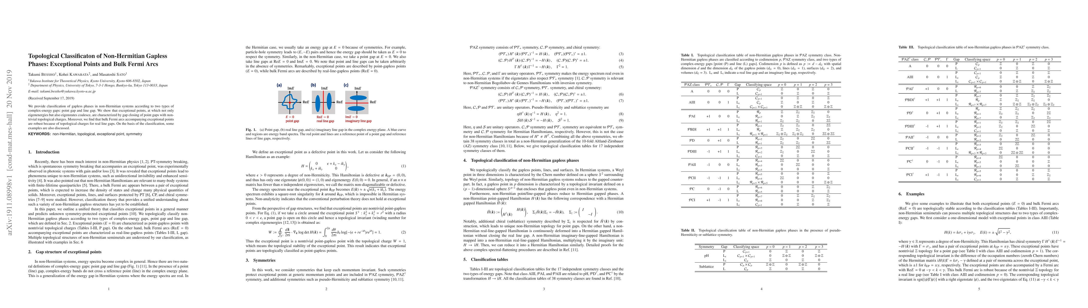 This paper classifies gapless phases in non-Hermitian systems based on point and line gaps, revealing that exceptional points feature nontrivial topological charges. Bulk Fermi arcs linked to these points are shown to be robust due to these topological charges.