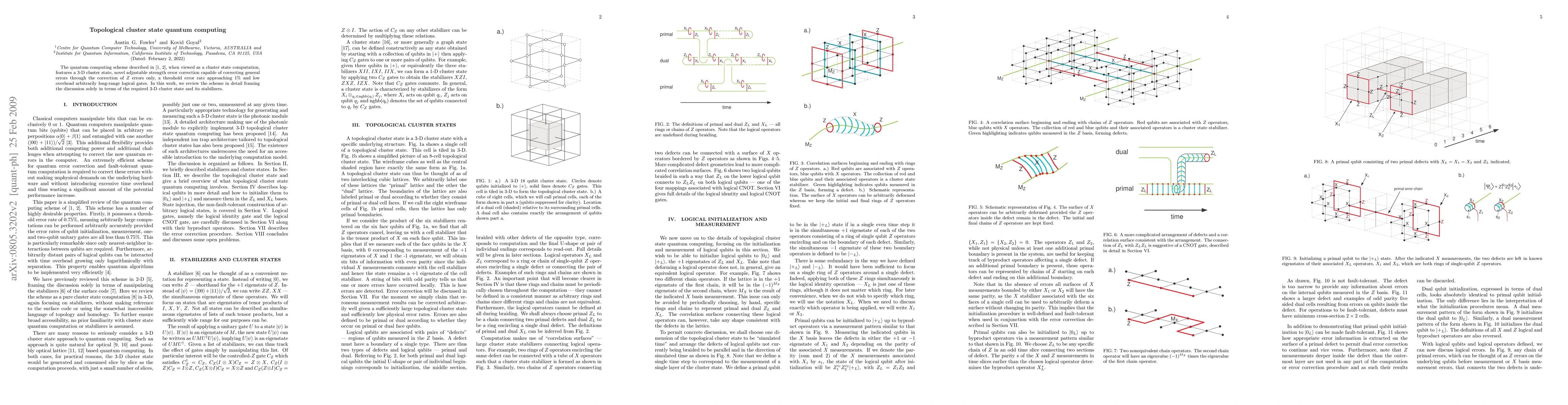 This paper reviews a quantum computing scheme based on a 3-D topological cluster state, emphasizing its error correction capabilities and low overhead for long-range logical gates, with a threshold error rate near 1%. The focus is on the cluster state's stabilizers and their role in correcting Z errors.