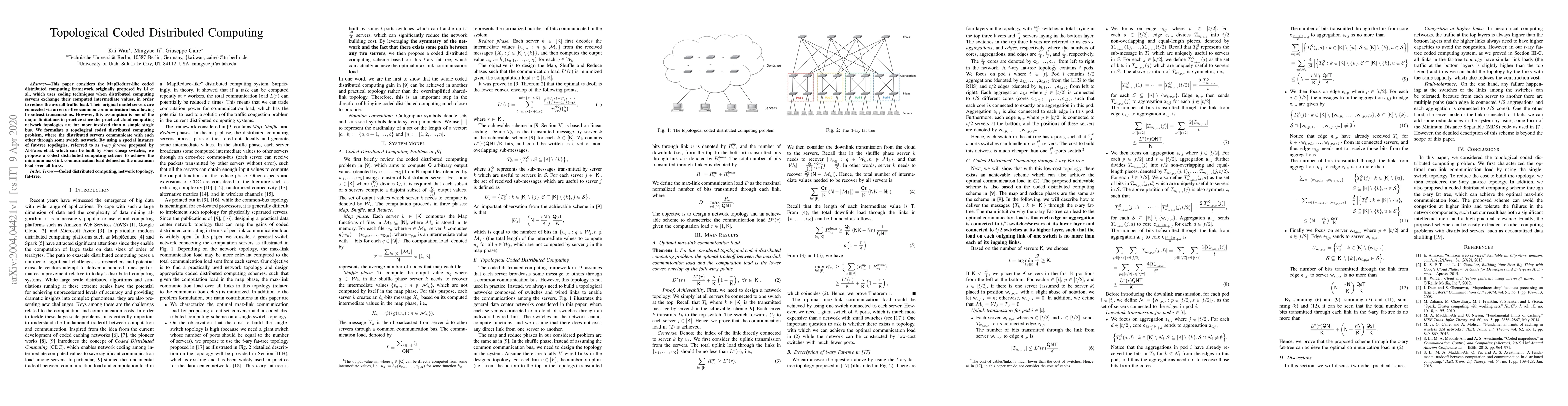 This paper considers the MapReduce-like coded distributed computing framework originally proposed by Li et al., which uses coding techniques when distributed computing servers exchange their computed intermediate values, in order to reduce the overall traffic load. Their original model servers are connected via an error-free common communication bus allowing broadcast transmissions. However, this assumption is one of the major limitations in practice since the practical cloud computing network topologies are far more involved than a simple single bus. We formulate a topological coded distributed computing problem, where the distributed servers communicate with each other through some switch network. By using a special instance of fat-tree topologies, referred to as t-ary fat-tree proposed by Al-Fares et al. which can be built by some cheap switches, we propose a coded distributed computing scheme to achieve the minimum max-link communication load defined as the maximum load over all links.