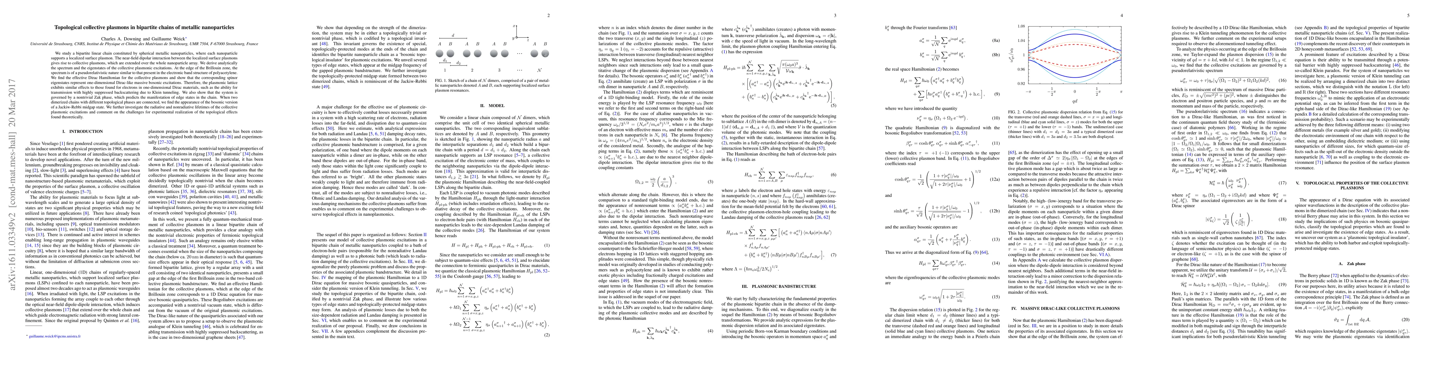 This paper investigates the collective plasmonic excitations in a bipartite chain of metallic nanoparticles, deriving an effective Dirac Hamiltonian and showing topological effects similar to those in Dirac materials, including Klein tunneling and edge states. The study also explores the radiative and nonradiative lifetimes of these excitations and discusses experimental challenges.