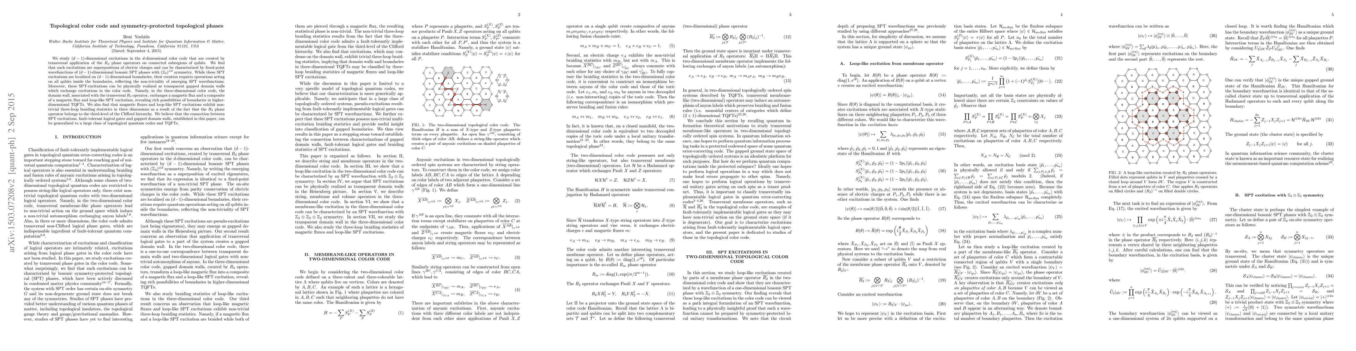 We study $(d-1)$-dimensional excitations in the $d$-dimensional color code that are created by transversal application of the $R_{d}$ phase operators on connected subregions of qubits. We find that such excitations are superpositions of electric charges and can be characterized by fixed-point wavefunctions of $(d-1)$-dimensional bosonic SPT phases with $(\mathbb{Z}_{2})^{\otimes d}$ symmetry. While these SPT excitations are localized on $(d-1)$-dimensional boundaries, their creation requires operations acting on all qubits inside the boundaries, reflecting the non-triviality of emerging SPT wavefunctions. Moreover, these SPT-excitations can be physically realized as transparent gapped domain walls which exchange excitations in the color code. Namely, in the three-dimensional color code, the domain wall, associated with the transversal $R_{3}$ operator, exchanges a magnetic flux and a composite of a magnetic flux and loop-like SPT excitation, revealing rich possibilities of boundaries in higher-dimensional TQFTs. We also find that magnetic fluxes and loop-like SPT excitations exhibit non-trivial three-loop braiding statistics in three dimensions as a result of the fact that the $R_{3}$ phase operator belongs to the third-level of the Clifford hierarchy. We believe that the connection between SPT excitations, fault-tolerant logical gates and gapped domain walls, established in this paper, can be generalized to a large class of topological quantum codes and TQFTs.