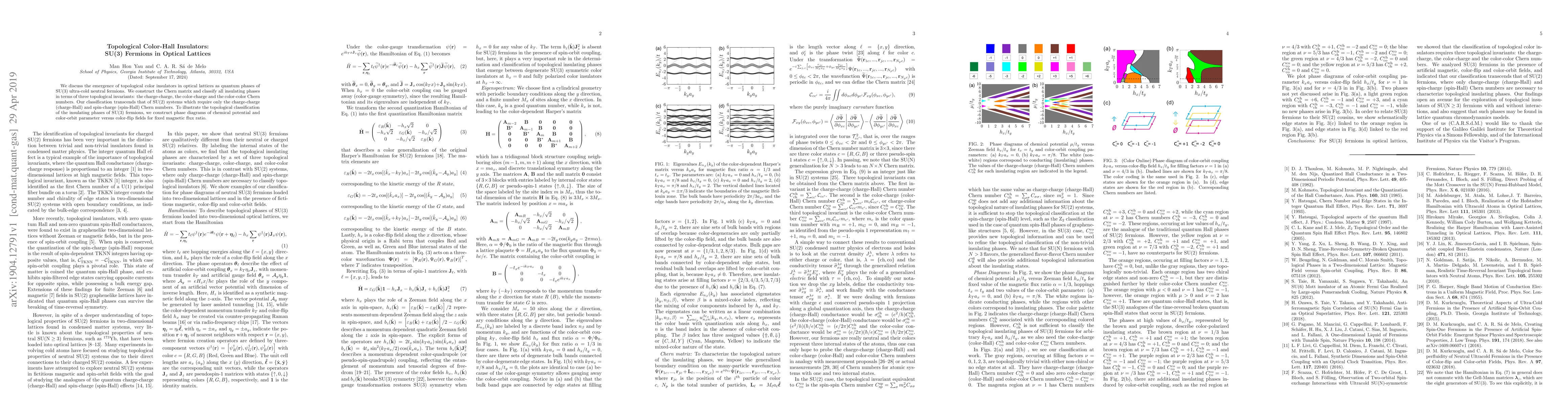 This paper explores topological color insulators in optical lattices using SU(3) fermions, introducing a new classification based on three topological invariants beyond those of SU(2) systems. The authors construct phase diagrams to illustrate these new insulating phases.
