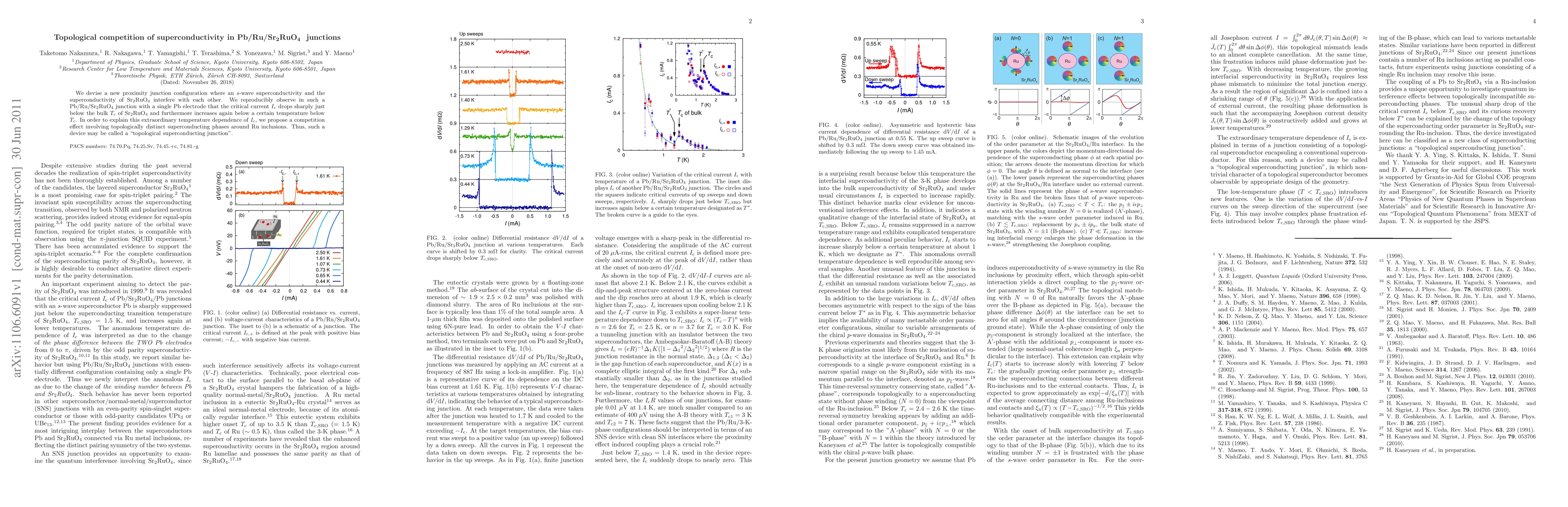 This paper investigates a novel Pb/Ru/Sr2RuO4 junction where s-wave superconductivity from Pb and Sr2RuO4's intrinsic superconductivity interact, leading to a sharp drop and subsequent increase in critical current Ic below Sr2RuO4's bulk Tc. The observed behavior is attributed to a competition effect among topologically distinct superconducting phases around Ru inclusions.