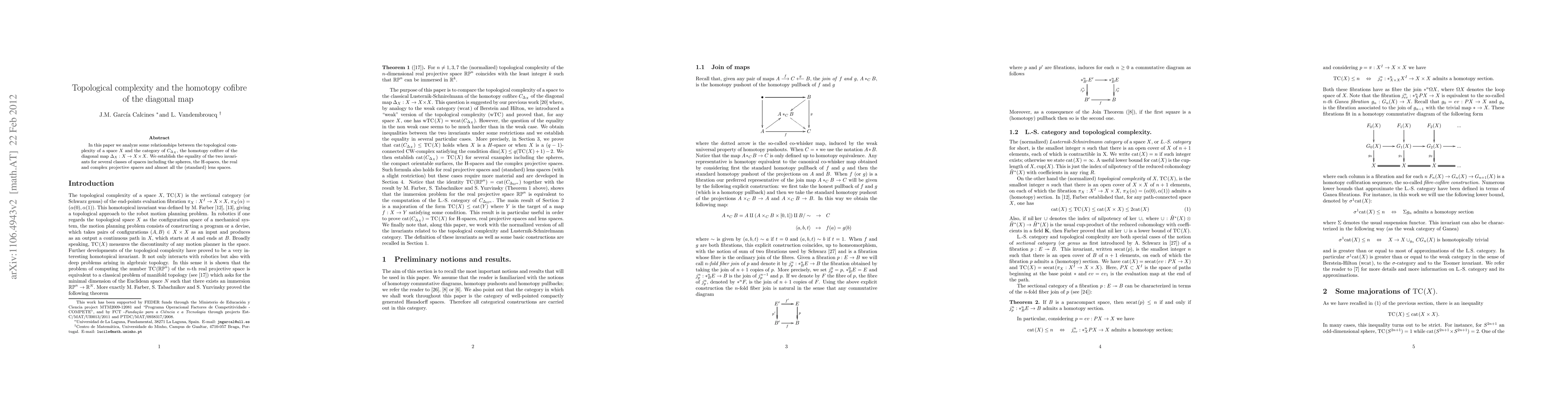 The paper introduces and proves relationships between topological complexity and the category of the homotopy cofiber of the diagonal map for various spaces, extending previous work in the field.