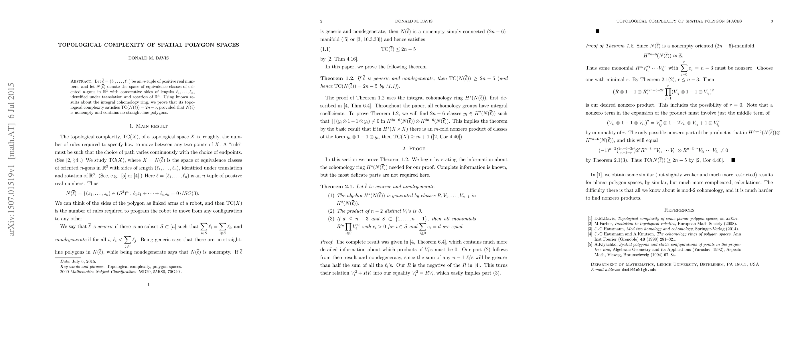 Using known results about their integral cohomology ring, we prove that the topological complexity of the space of n-gons in R^3 with prescribed side lengths equals 2n-5, assuming that the space is nonempty and does not contain any straight-line polygons.
