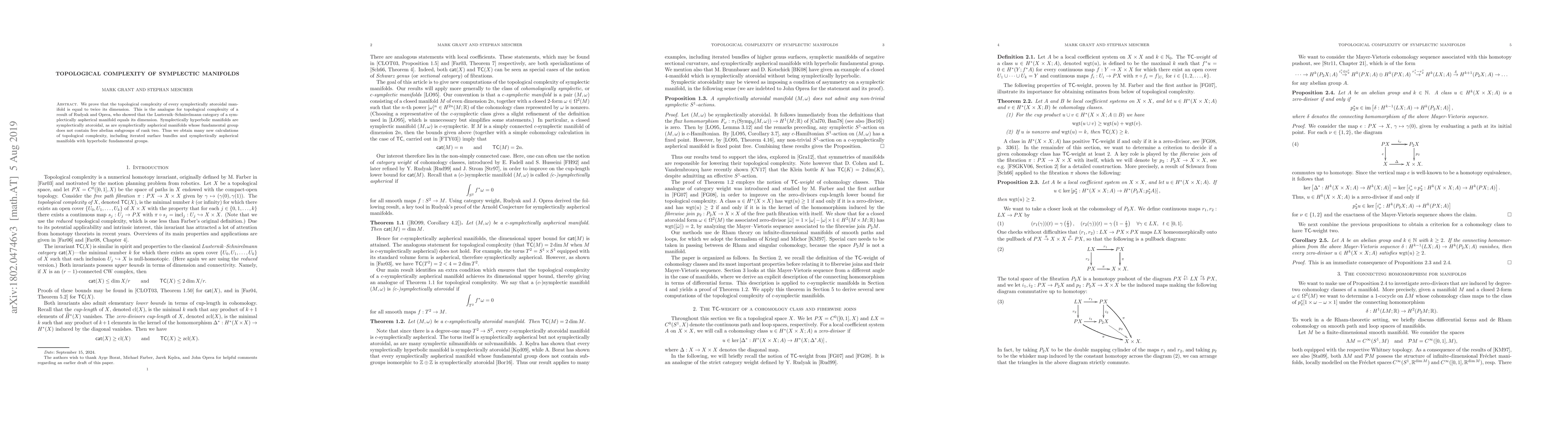 This paper establishes that the topological complexity of symplectically atoroidal manifolds equals twice their dimension, extending a result from Lusternik--Schnirelmann category to topological complexity. The findings apply to various symplectically hyperbolic and aspherical manifolds, including iterated surface bundles and those with hyperbolic fundamental groups.
