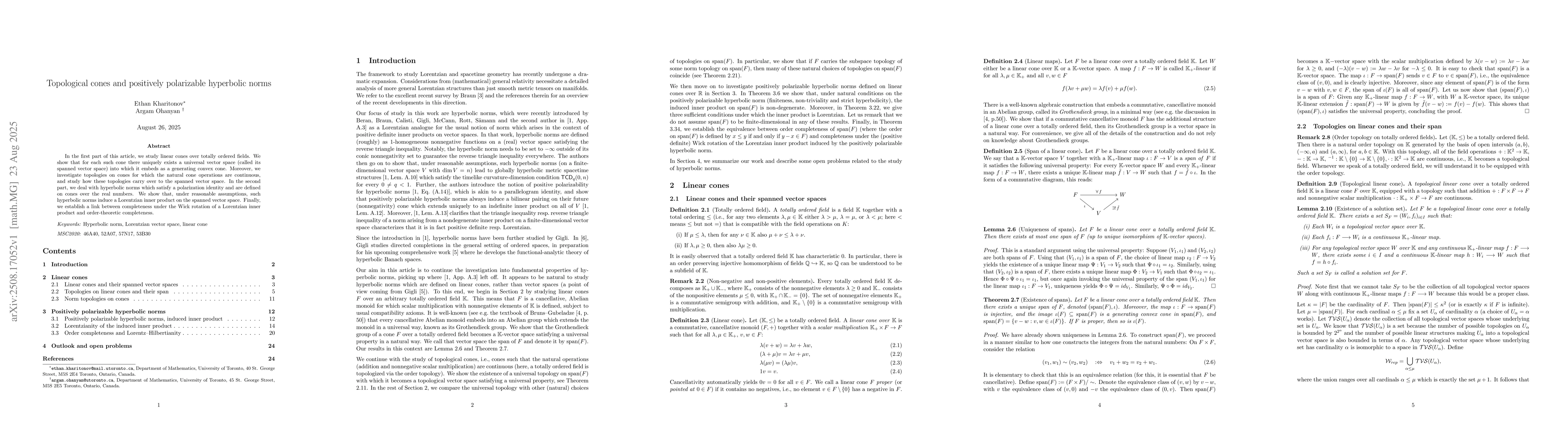 In the first part of this article, we study linear cones over totally ordered fields. We show that for each such cone there uniquely exists a universal vector space (called its spanned vector space) into which it embeds as a generating convex cone. Moreover, we investigate topologies on cones for which the natural cone operations are continuous, and study how these topologies carry over to the spanned vector space. In the second part, we deal with hyperbolic norms which satisfy a polarization identity and are defined on cones over the real numbers. We show that, under reasonable assumptions, such hyperbolic norms induce a Lorentzian inner product on the spanned vector space. Finally, we establish a link between completeness under the Wick rotation of a Lorentzian inner product and order-theoretic completeness.