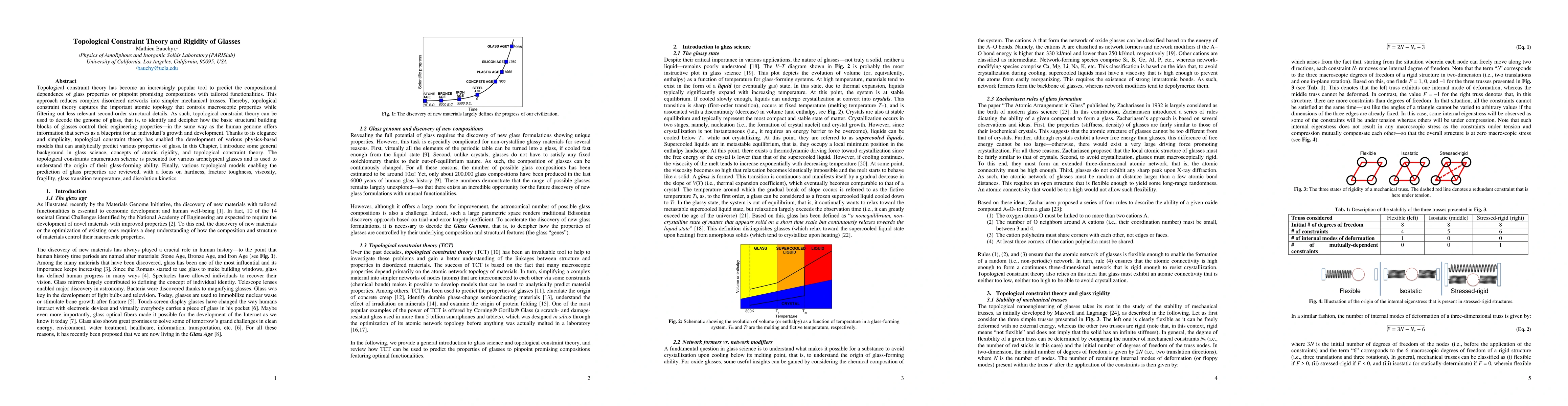 Topological constraint theory has become an increasingly popular tool to predict the compositional dependence of glass properties or pinpoint promising compositions with tailored functionalities. This approach reduces complex disordered networks into simpler mechanical trusses. Thereby, topological constraint theory captures the important atomic topology that controls macroscopic properties while filtering out less relevant second-order structural details. As such, topological constraint theory can be used to decode the genome of glass, that is, to identify and decipher how the basic structural building blocks of glasses control their engineering properties---in the same way as the human genome offers information that serves as a blueprint for an individual's growth and development. Thanks to its elegance and simplicity, topological constraint theory has enabled the development of various physics-based models that can analytically predict various properties of glass. In this Chapter, I introduce some general background in glass science, concepts of atomic rigidity, and topological constraint theory. The topological constraints enumeration scheme is presented for various archetypical glasses and is used to understand the origin of their glass-forming ability. Finally, various topological models enabling the prediction of glass properties are reviewed, with a focus on hardness, fracture toughness, viscosity, fragility, glass transition temperature, and dissolution kinetics.