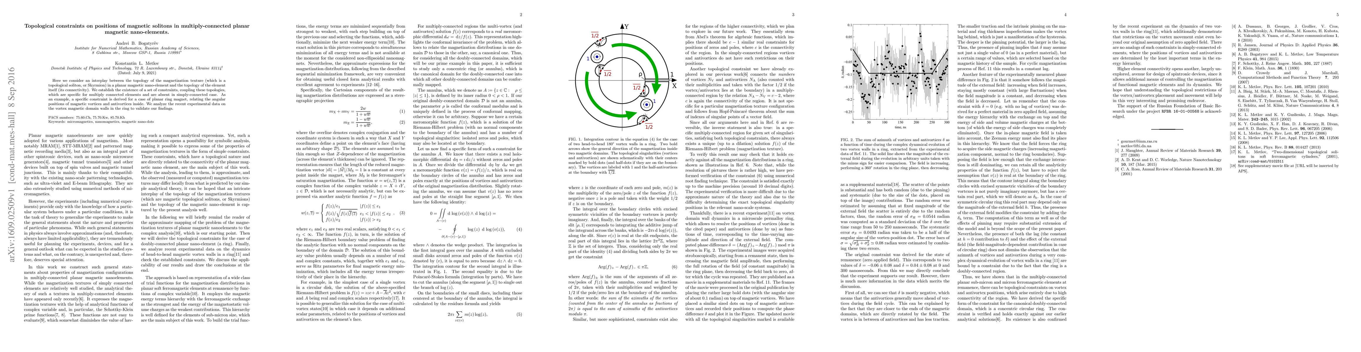 Researchers found topological constraints in magnetic solitons of multiply-connected planar nano-elements that affect their positions, distinct from simply-connected elements.